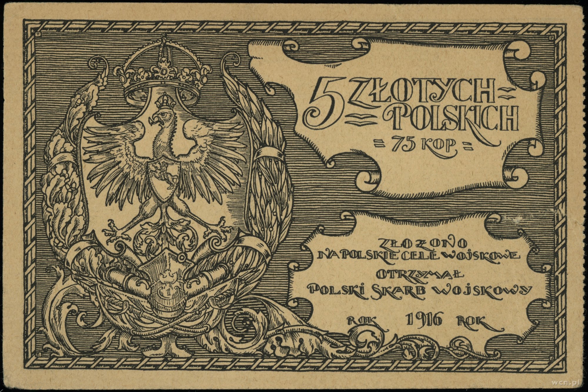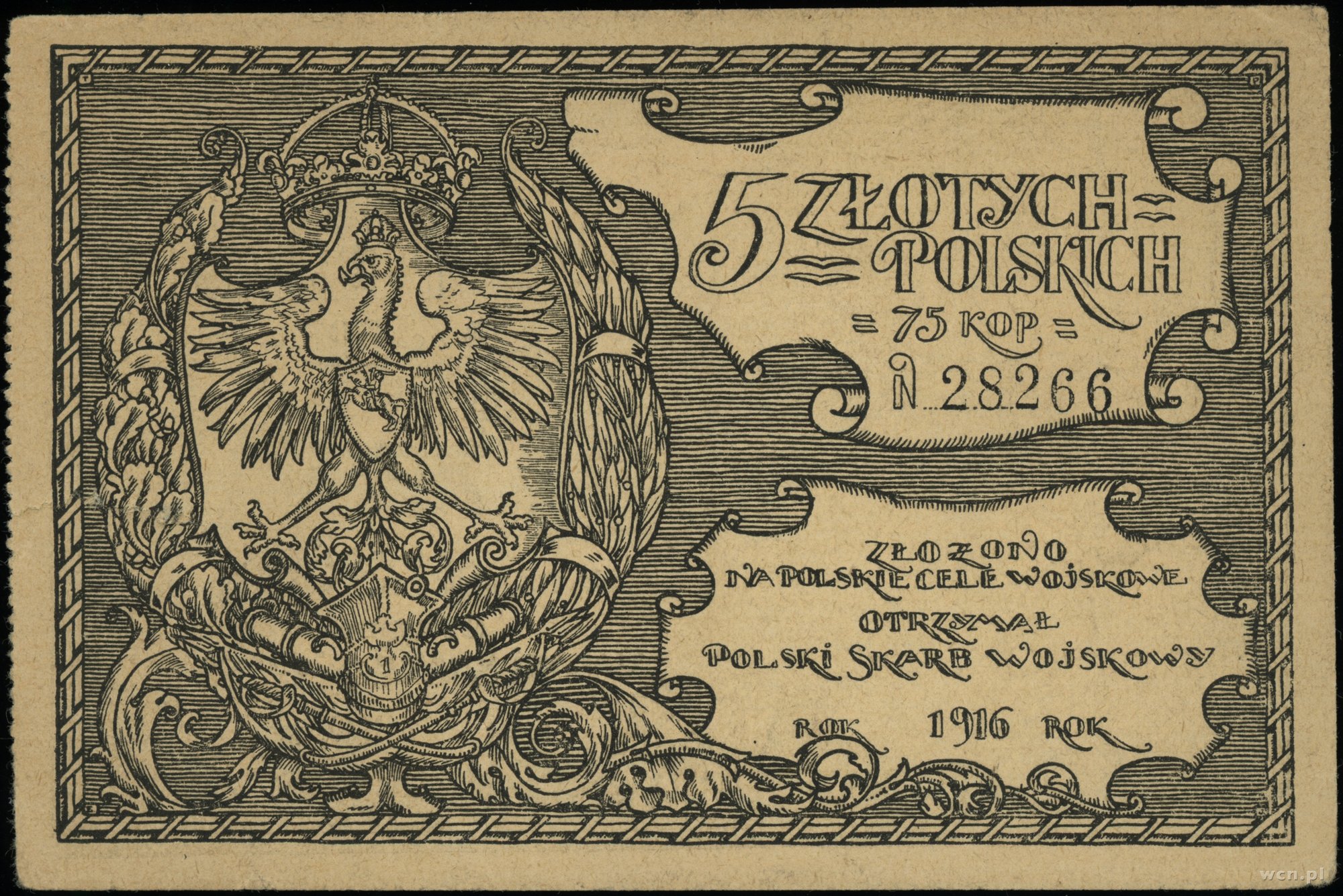 | 96 | Dokumenty, asygnaty, bony i pokwitowania wydane na cele patriotyczne w latach 1914-1924. bon 5 złotych, 1916, numeracja 28266; Polski Skarb Wojskowy, bez kuponu; Luco.. | 0 zł | ||