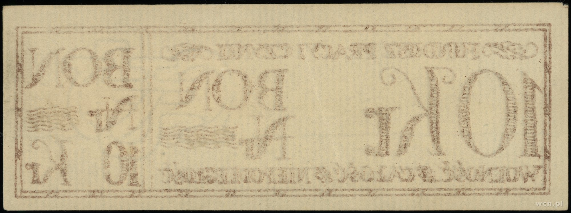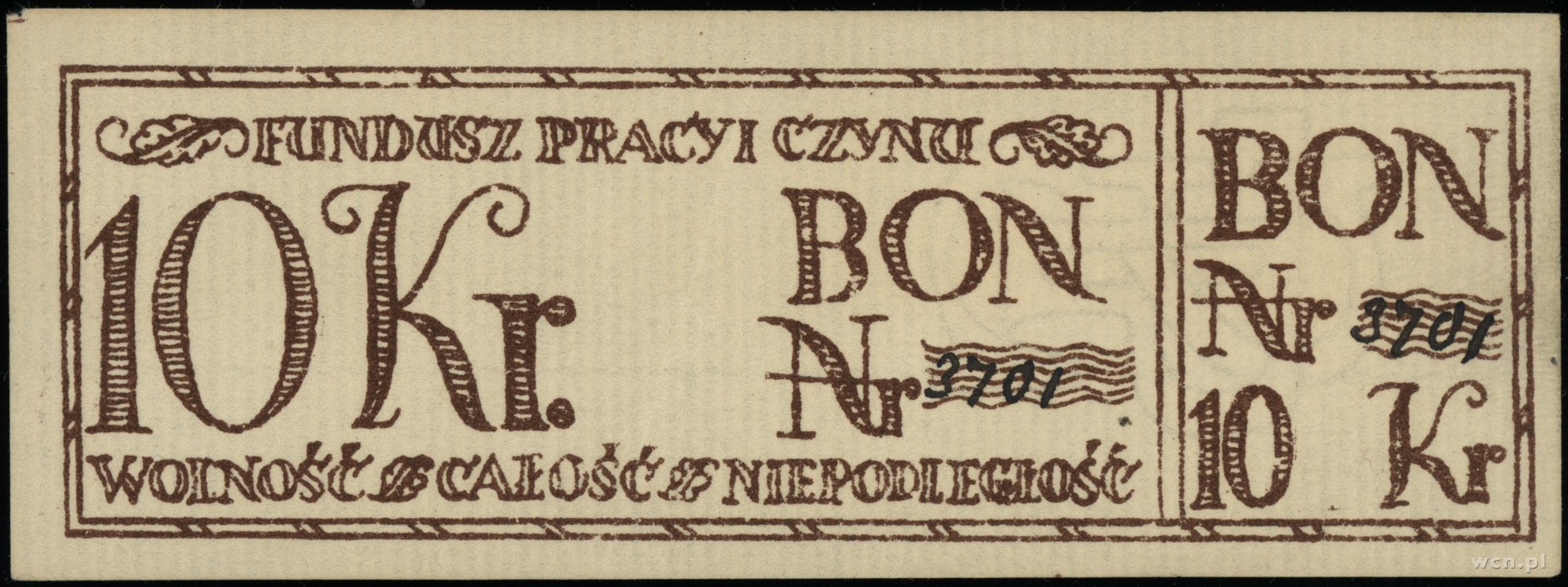 | 97 | Dokumenty, asygnaty, bony i pokwitowania wydane na cele patriotyczne w latach 1914-1924. bon 10 koron, bez daty, numeracja 3701; Fundusz Pracy i Czynu, Wolność-Całość.. | 0 zł | ||