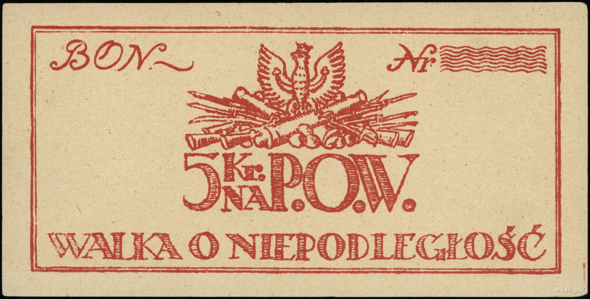 | 98 | Dokumenty, asygnaty, bony i pokwitowania wydane na cele patriotyczne w latach 1914-1924. bon 5 koron, 02.1918; seria brak; Polska Organizacja Wojskowa, Walka O Niepod.. | 0 zł | ||
