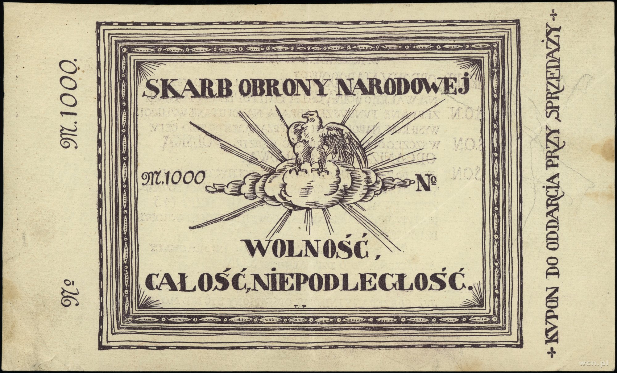| 99 | Dokumenty, asygnaty, bony i pokwitowania wydane na cele patriotyczne w latach 1914-1924. bon 1.000 marek, 1918; seria brak; Skarb Obrony Narodowej, Wolność-Całość-Nie.. | 0 zł | ||