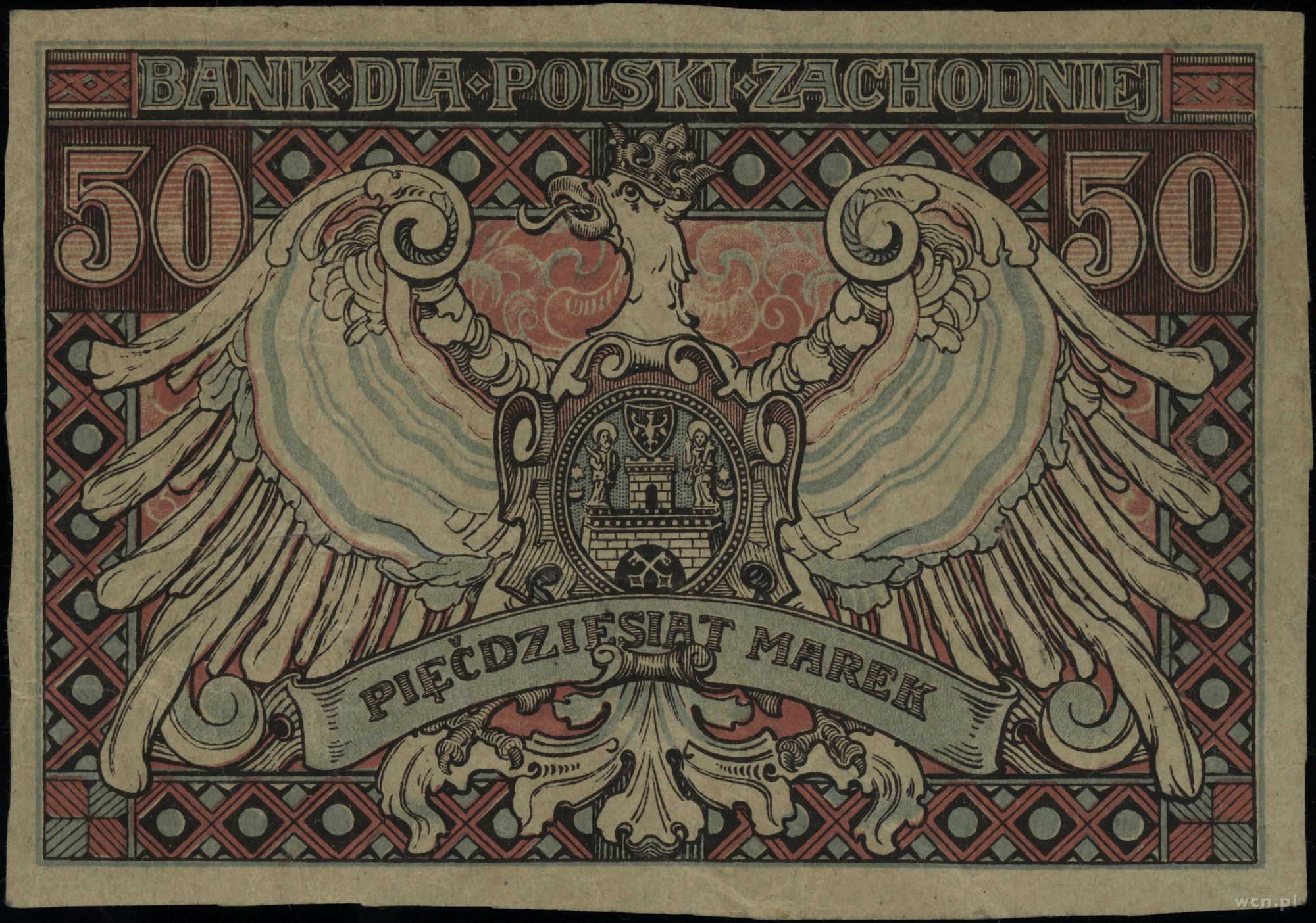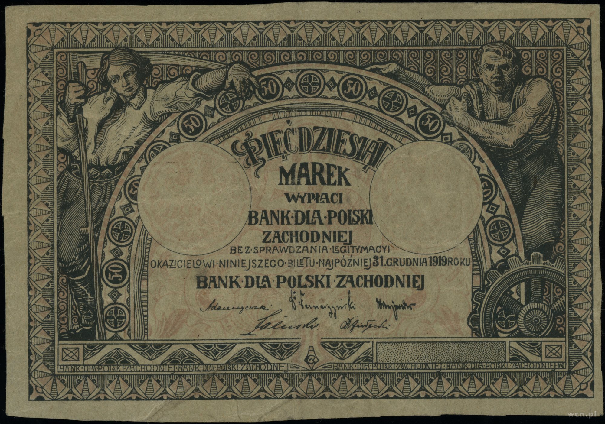 | 100 | Dokumenty, asygnaty, bony i pokwitowania wydane na cele patriotyczne w latach 1914-1924. bon 50 marek, [1919]; seria brak; Bank Dla Polski Zachodniej, drugi egzemplar.. | 0 zł |