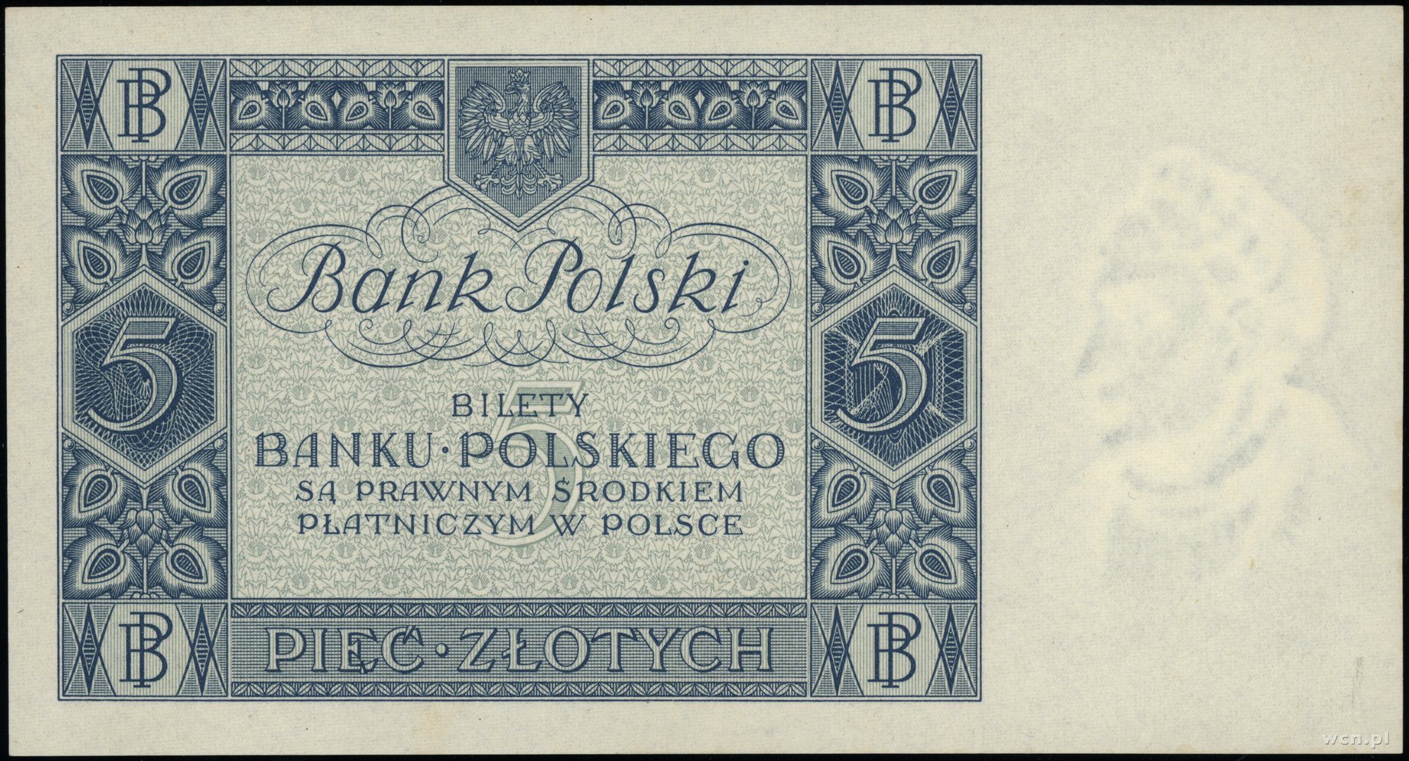 | 121 | Bank Polski, emisja 1930-1934. 5 złotych, 2.01.1930; seria I., numeracja 3994713; Lucow 658 (R1), Miłczak 71a, Pick 72; w opakowaniu firmy PMG 2462835-022 z oceną 66 .. | 0 zł | ||