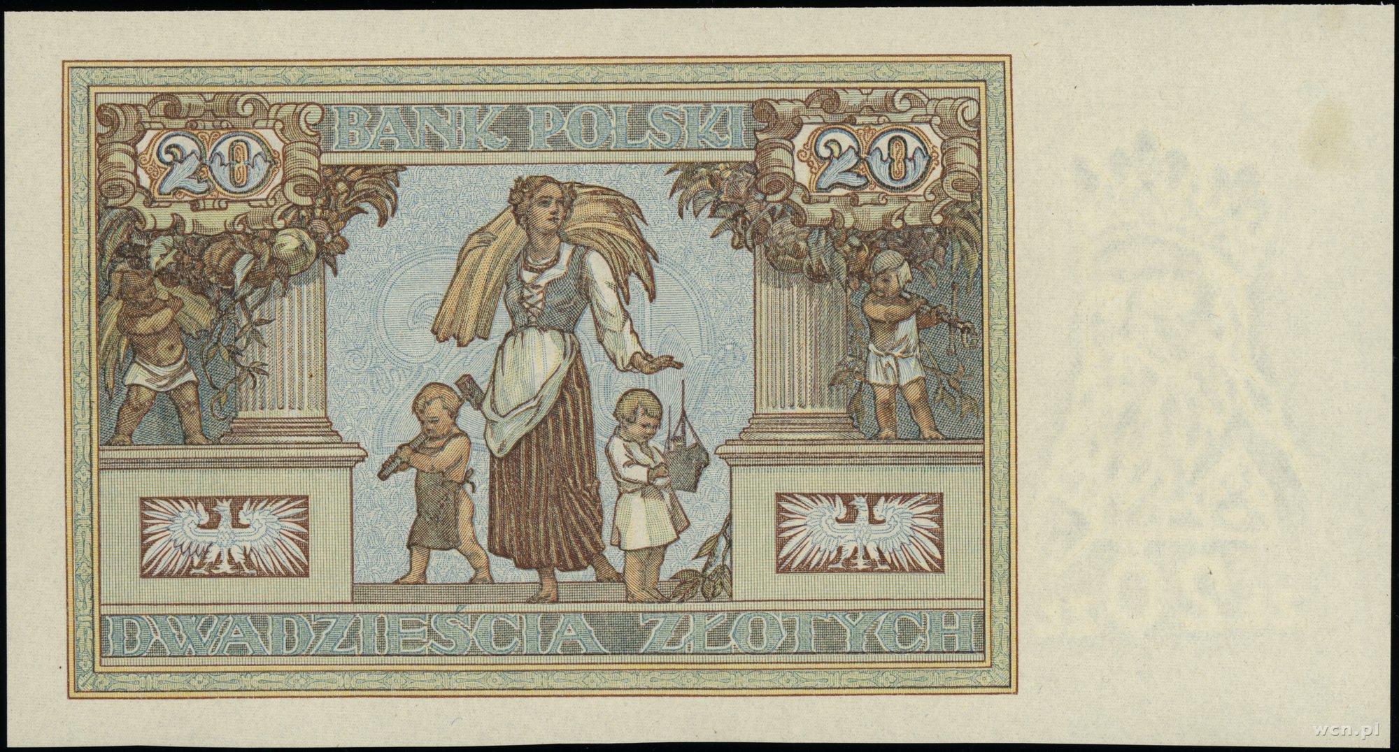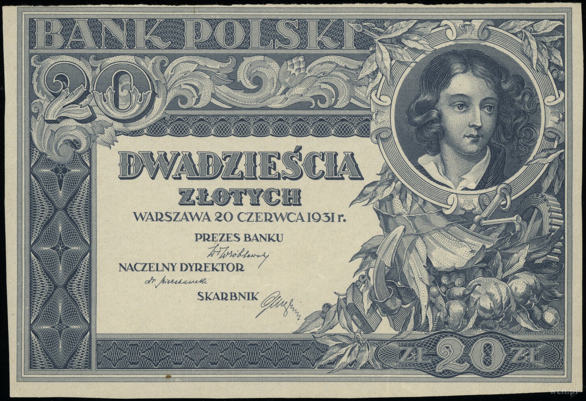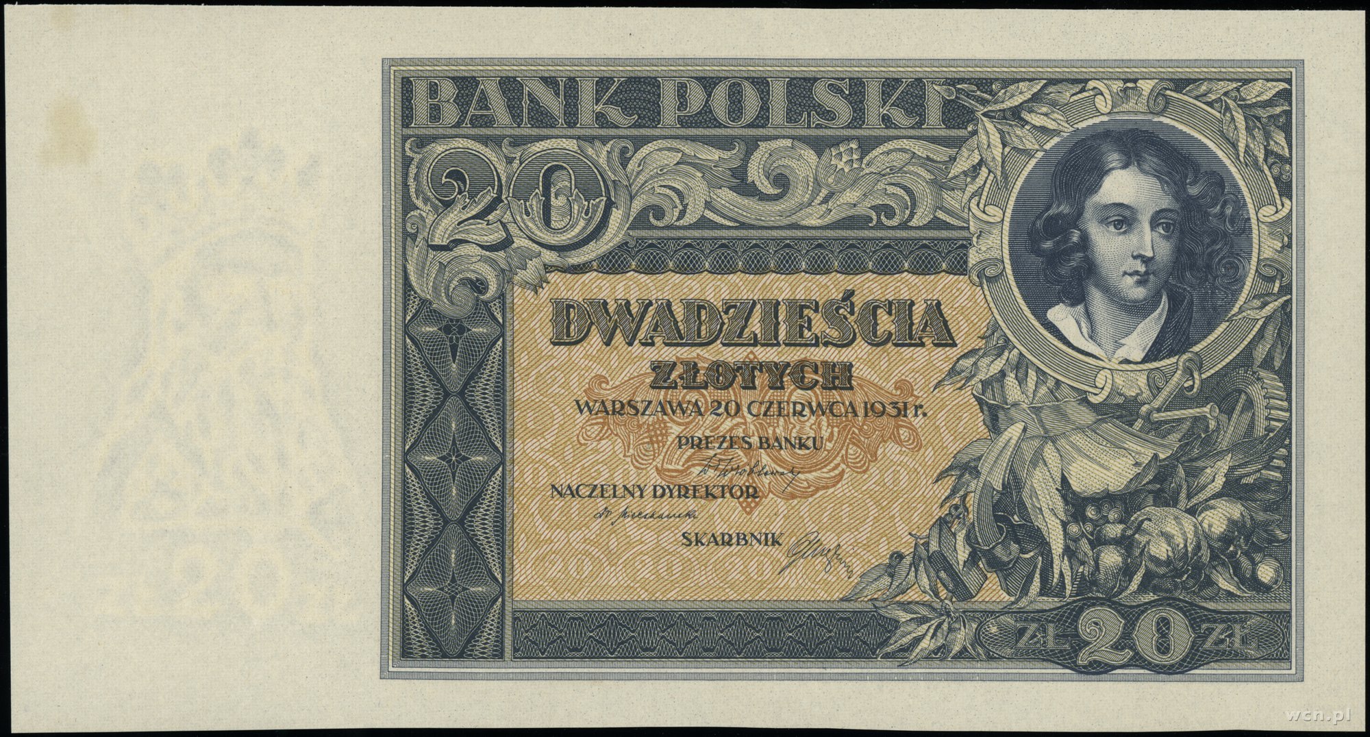| 123 | Bank Polski, emisja 1930-1934. 20 złotych, 20.06.1931; seria brak; Lucow 664 (R7) - ilustrowany w katalogu kolekcji, Miłczak 72 var, Pick 73 var; w opakowaniu firmy P.. | 0 zł | ||