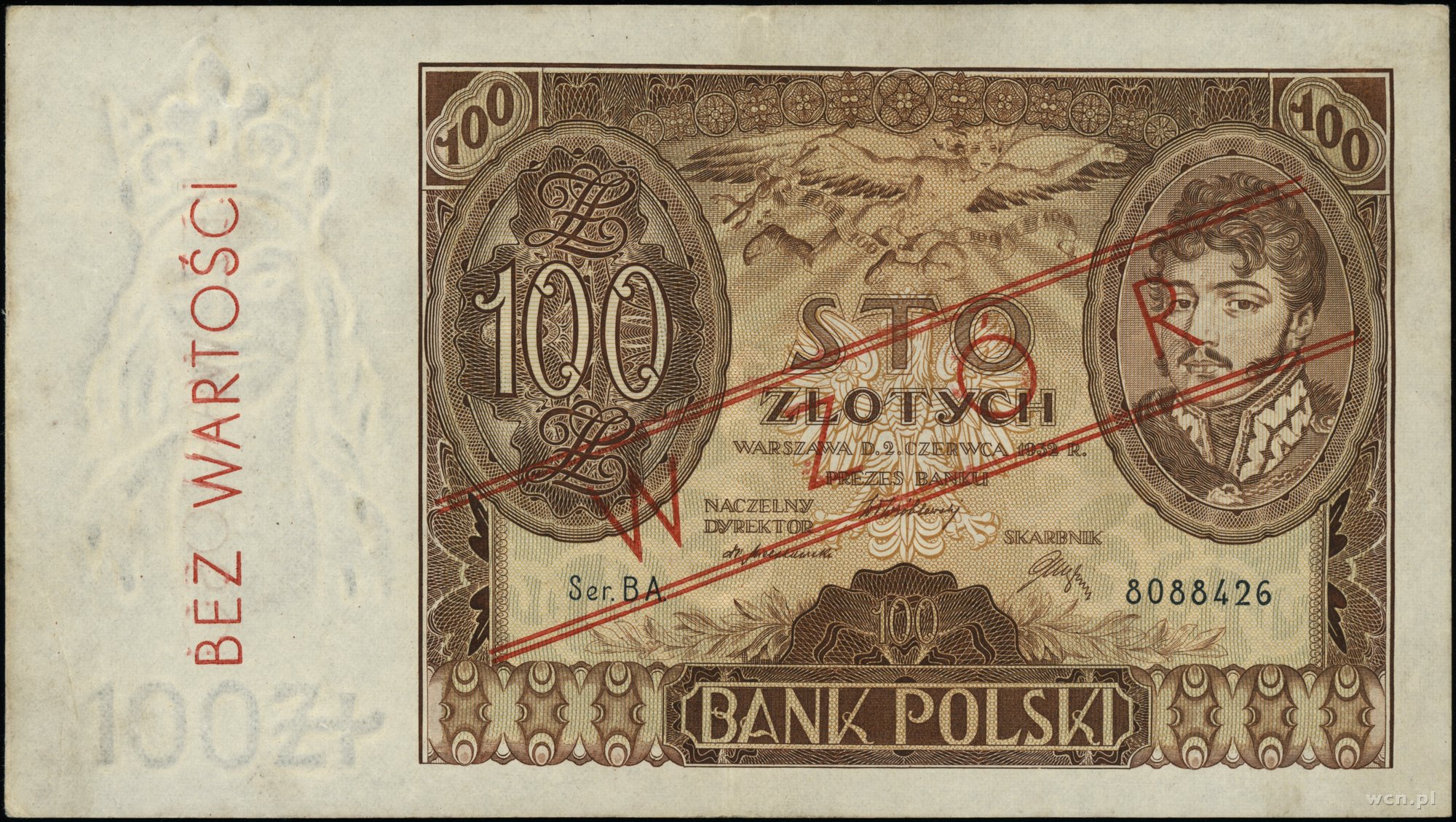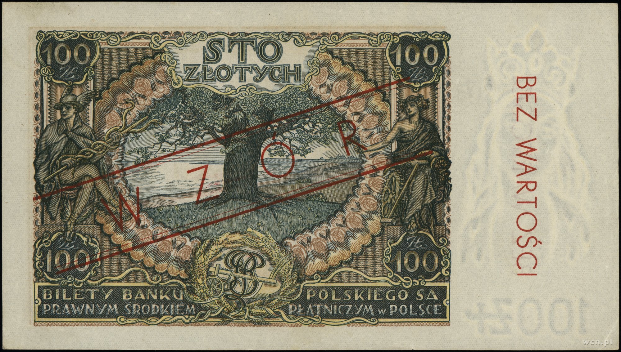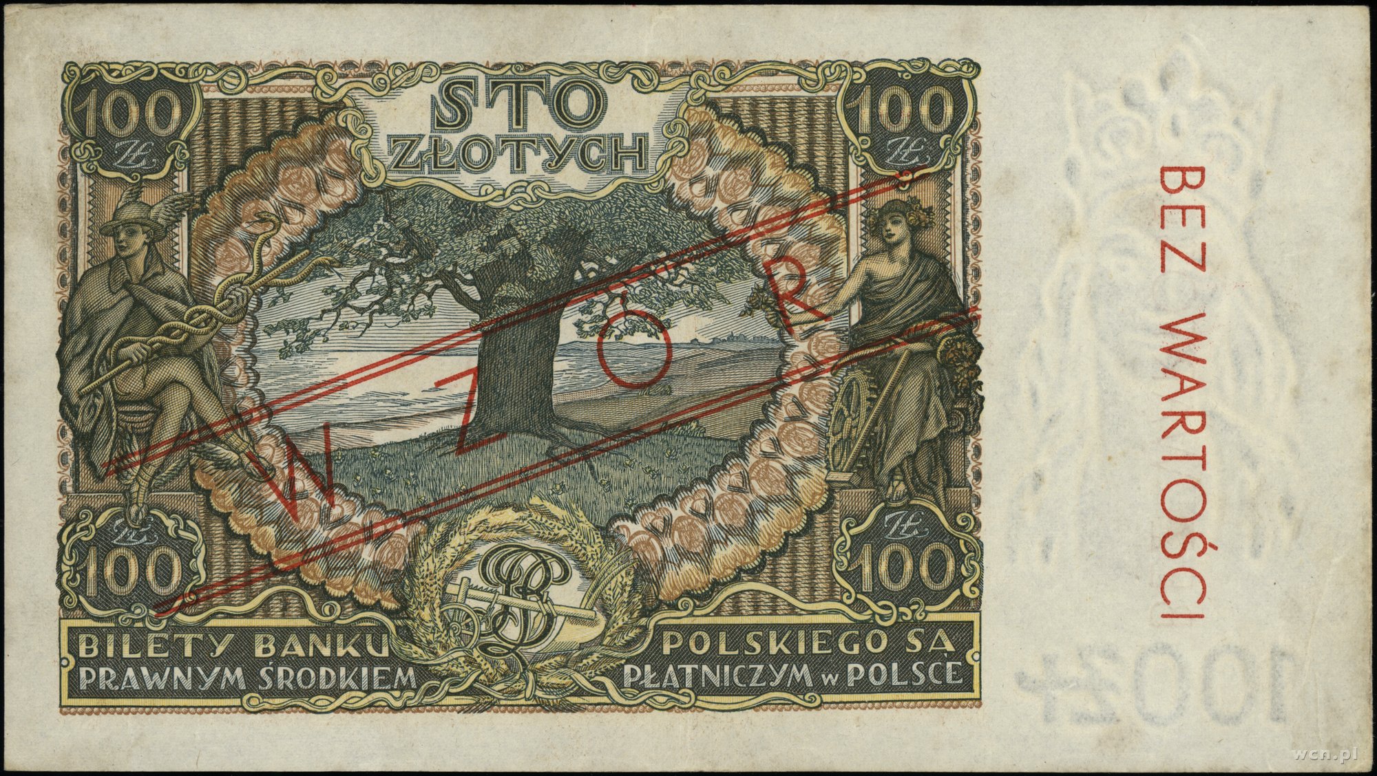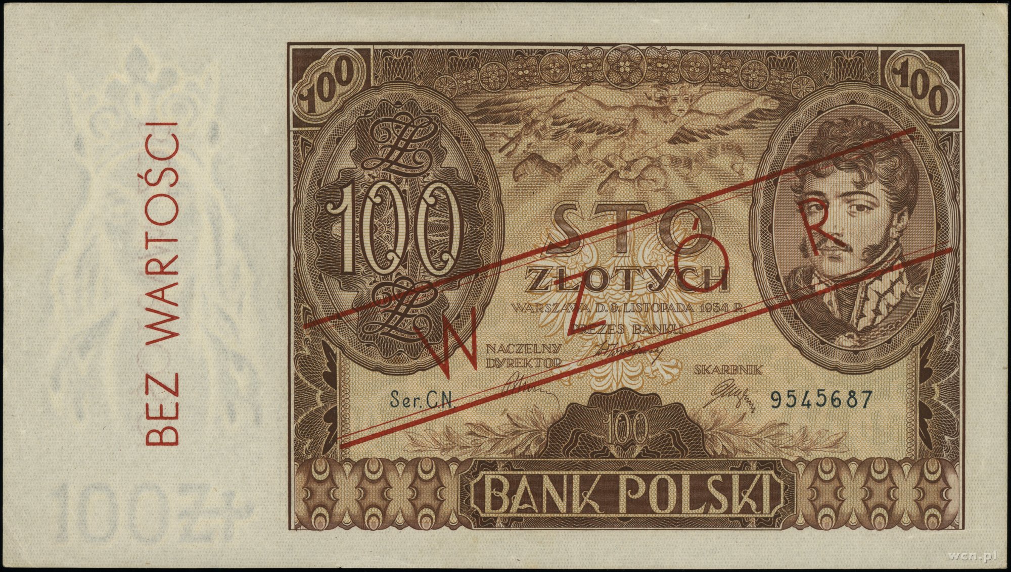 | 126 | Bank Polski, emisja 1930-1934. 100 złotych, 9.11.1934; seria C.N., numeracja 9545687; wzór biletu, w oznaczeniu serii 2 kropki; Lucow 674a (R4), Miłczak 74W ?, Pick 7.. | 0 zł | ||