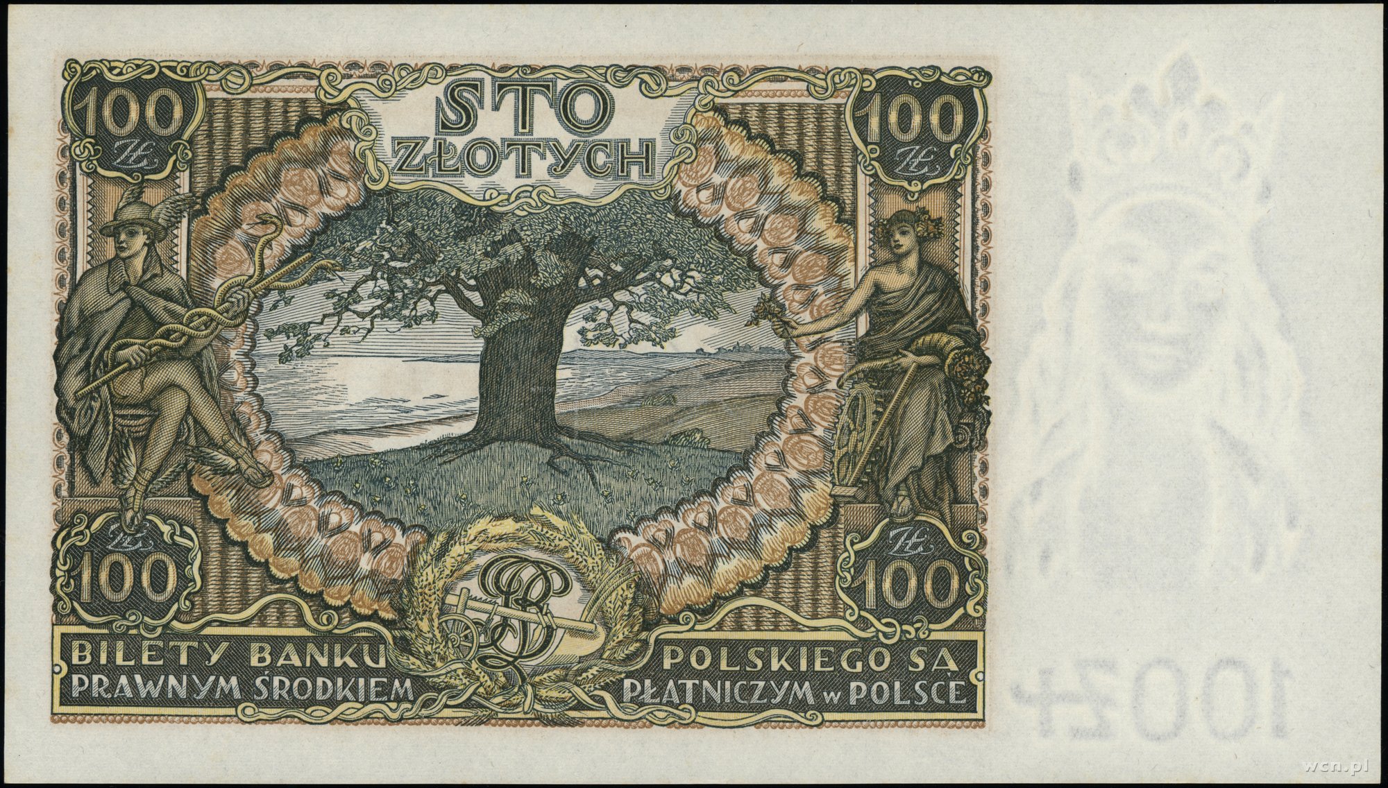 | 127 | Bank Polski, emisja 1930-1934. 100 złotych, 9.11.1934; seria BM., numeracja 9493107; dodatkowy znak wodny +X+; Lucow 675a (R2), Miłczak 74b, Pick 75b; w opakowaniu fi.. | 0 zł | ||