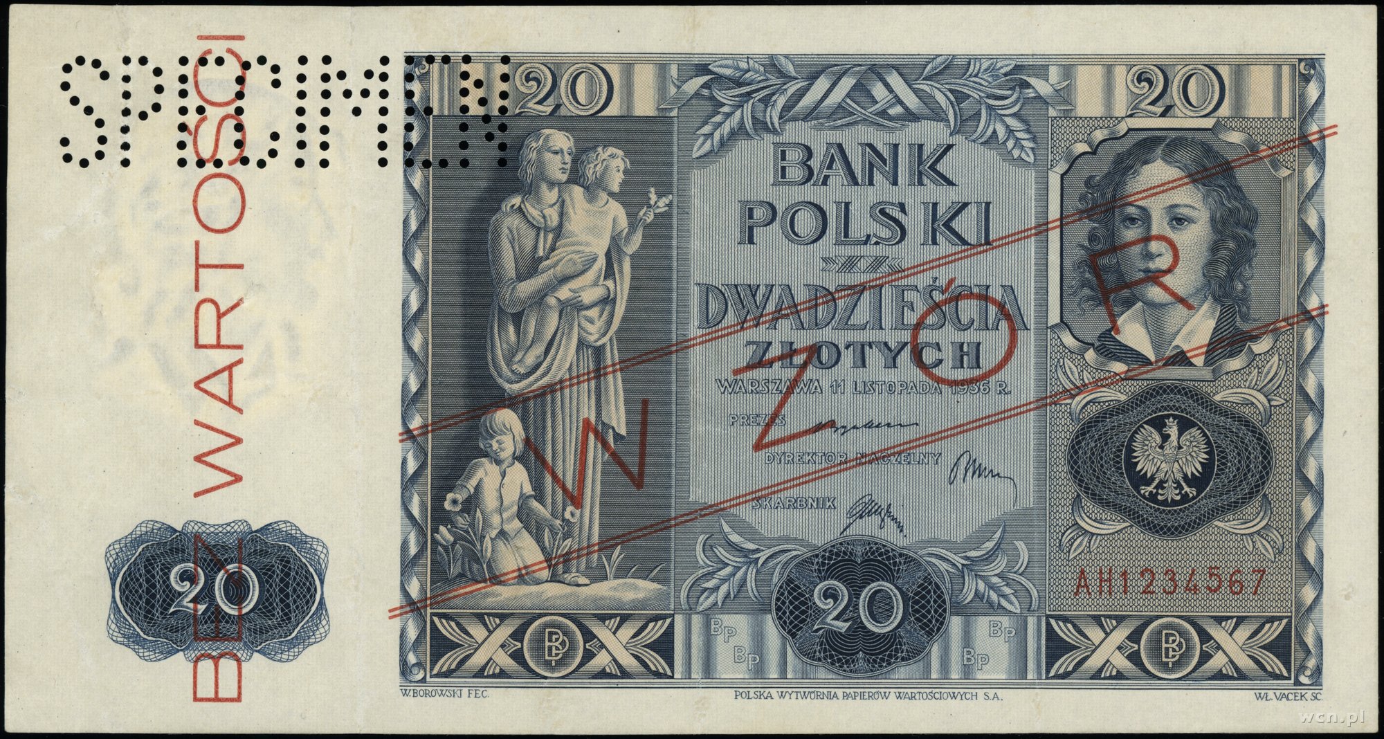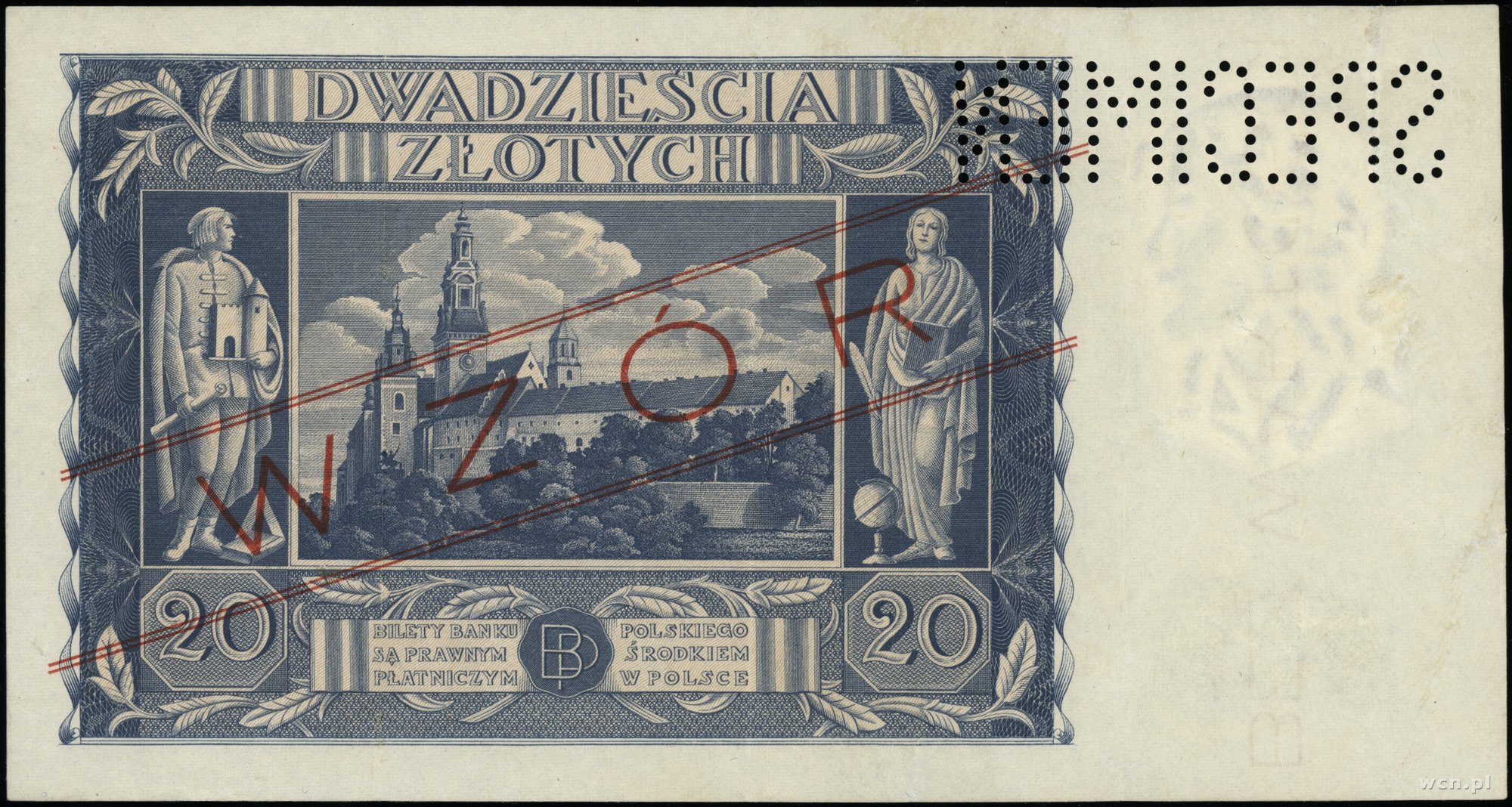 | 129 | Bank Polski, emisja 1936. 20 złotych, 11.11.1936; seria AH, numeracja 1234567; perforowany napis SPECIMEN; Lucow 685 (R5), Miłczak 76Wb, Pick 77 var; w opakowaniu fir.. | 0 zł | ||