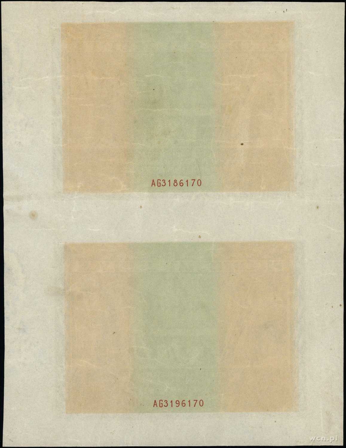 | 130 | Bank Polski, emisja 1936. 50 złotych, 11.11.1936; seria AG, numeracja 3186170 / 3196170; 2 egzemplarze nierozcięte, niepełny druk str. głównej, poddruk irysowy; Lucow.. | 0 zł | ||