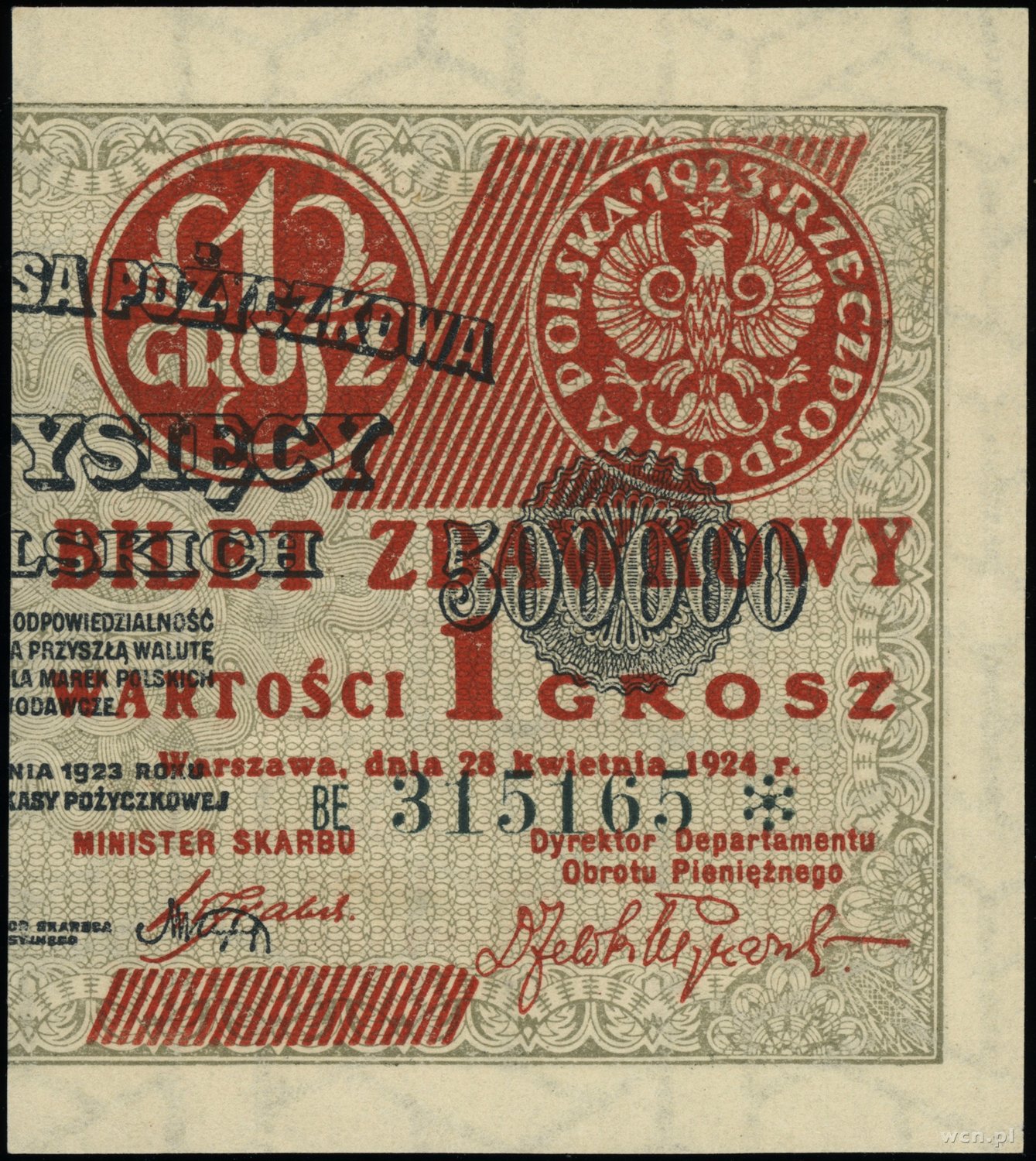 | 132 | Bilety zdawkowe Ministerstwa Skarbu z 1924 i 1925 r.. 1 grosz, 28.04.1924; seria BE, numeracja 315165*; nadruk na prawej części; Lucow 694 (R1), Miłczak 42a/bP, Pick .. | 0 zł | ||