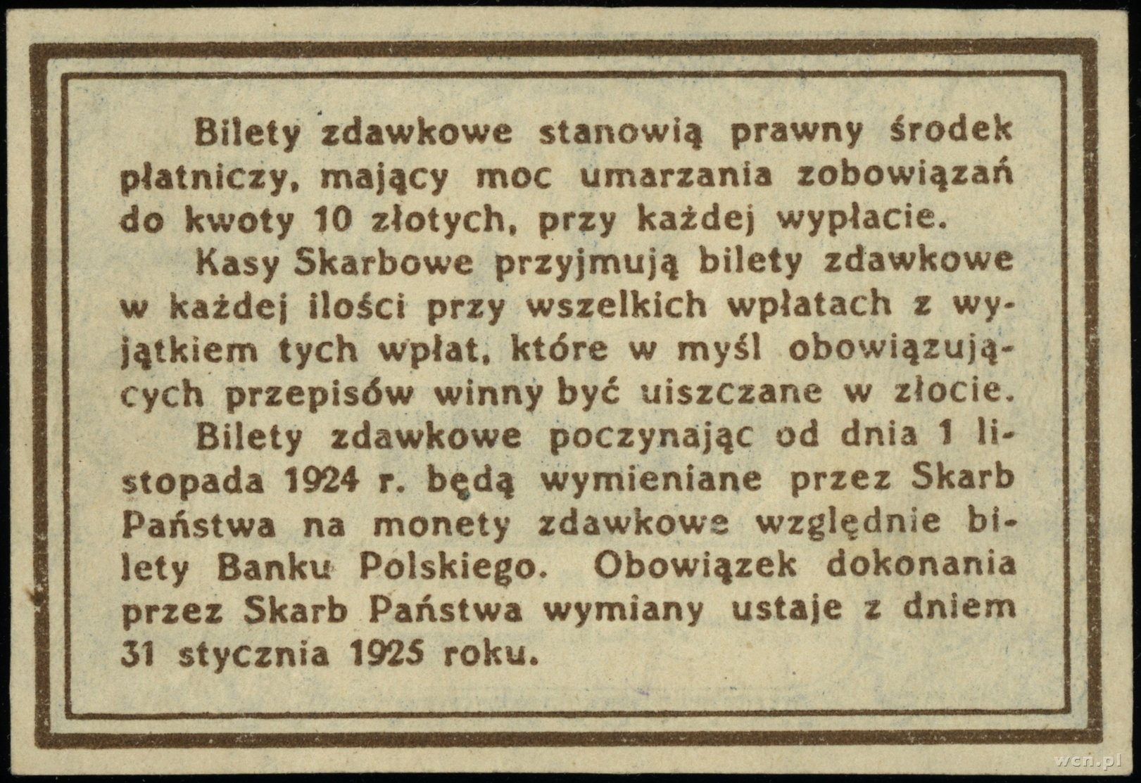 | 133 | Bilety zdawkowe Ministerstwa Skarbu z 1924 i 1925 r.. 10 groszy, 28.04.1924; seria brak; Lucow 701 (R2) - ilustrowany w katalogu kolekcji, Miłczak 44, Pick 44; w opak.. | 0 zł | ||