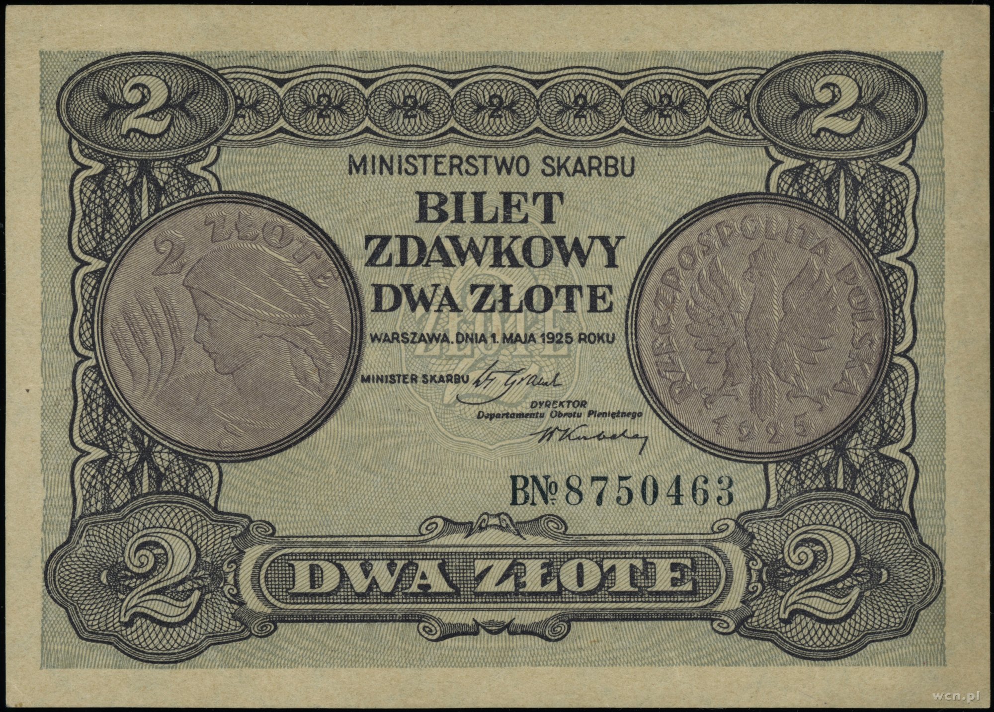| 134 | Bilety zdawkowe Ministerstwa Skarbu z 1924 i 1925 r.. 2 złote, 1.05.1925; seria B, numeracja 8750463; Lucow 705 (R3) - dołączony do kolekcji po wydrukowaniu katalogu,.. | 0 zł | ||
