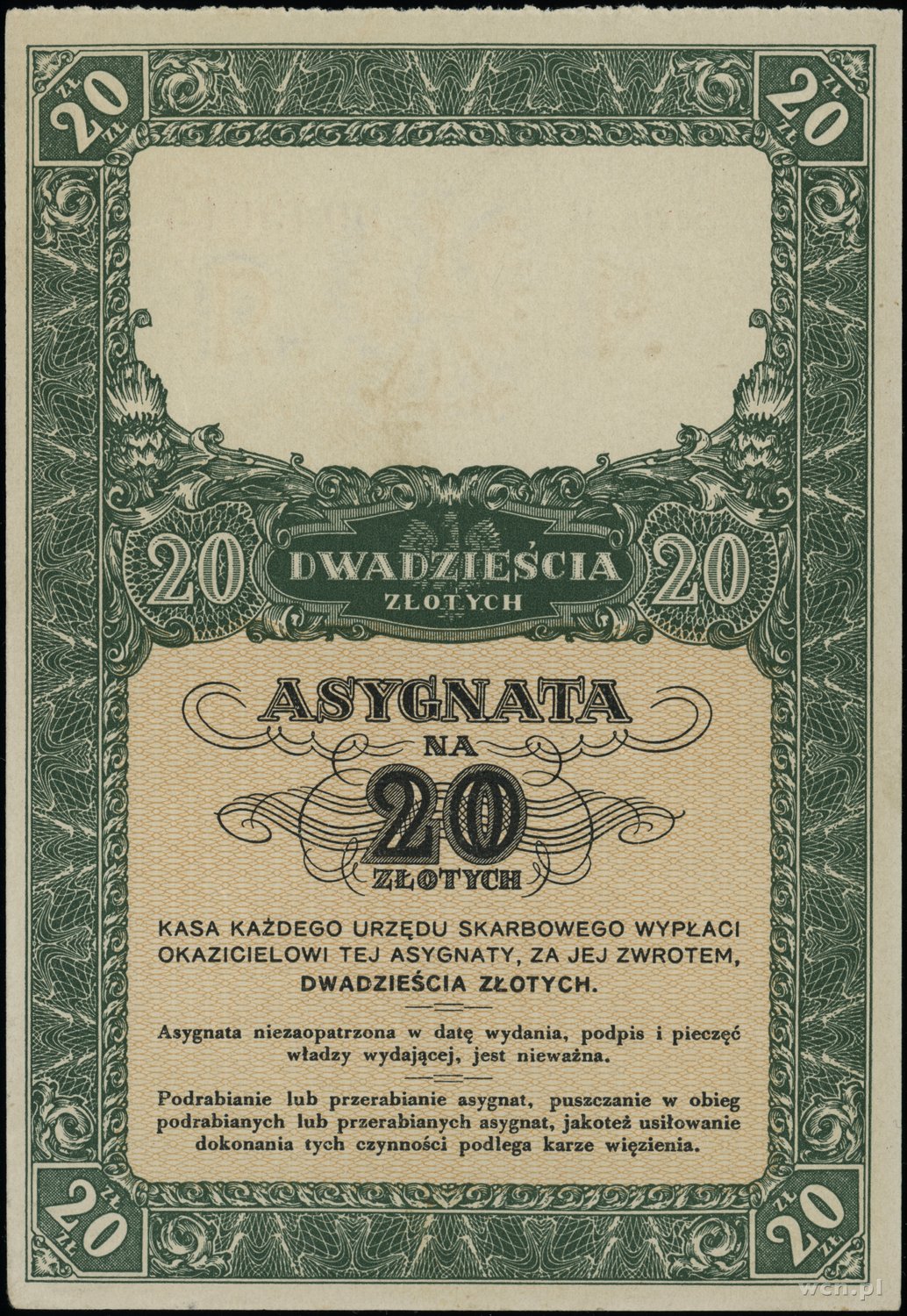 | 138 | Dokumenty, asygnaty, bony i bilety skarbowe z lat 1923-1939. asygnata na 20 złotych, [1939]; seria B, numeracja 0943015; Ministerstwo Skarbu; Lucow 736 (R2) | 0 zł | ||