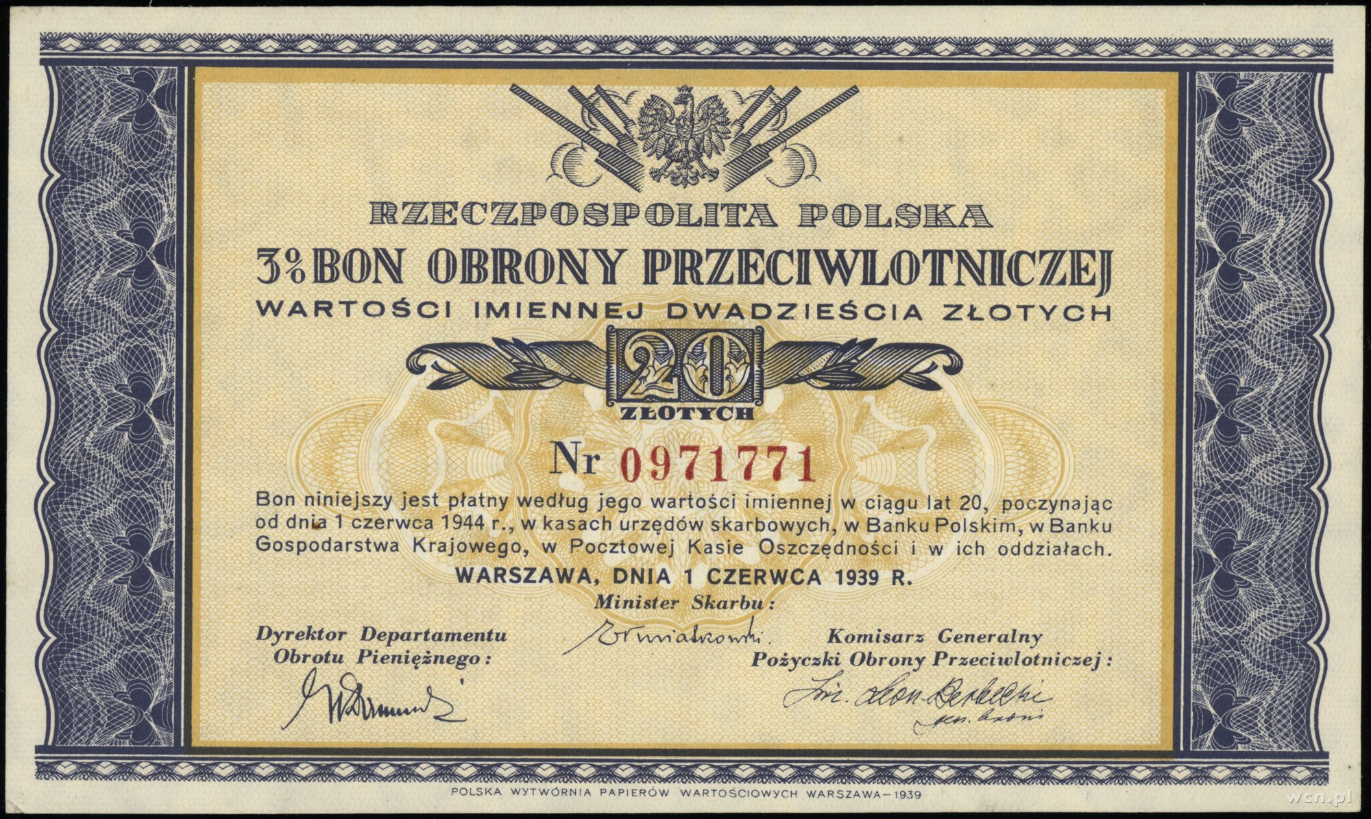 | 139 | Dokumenty, asygnaty, bony i bilety skarbowe z lat 1923-1939. bon obrony przeciwlotniczej na 20 złotych, 1.06.1939, numeracja 0971771; Lucow 744 (R0) | 0 zł | ||