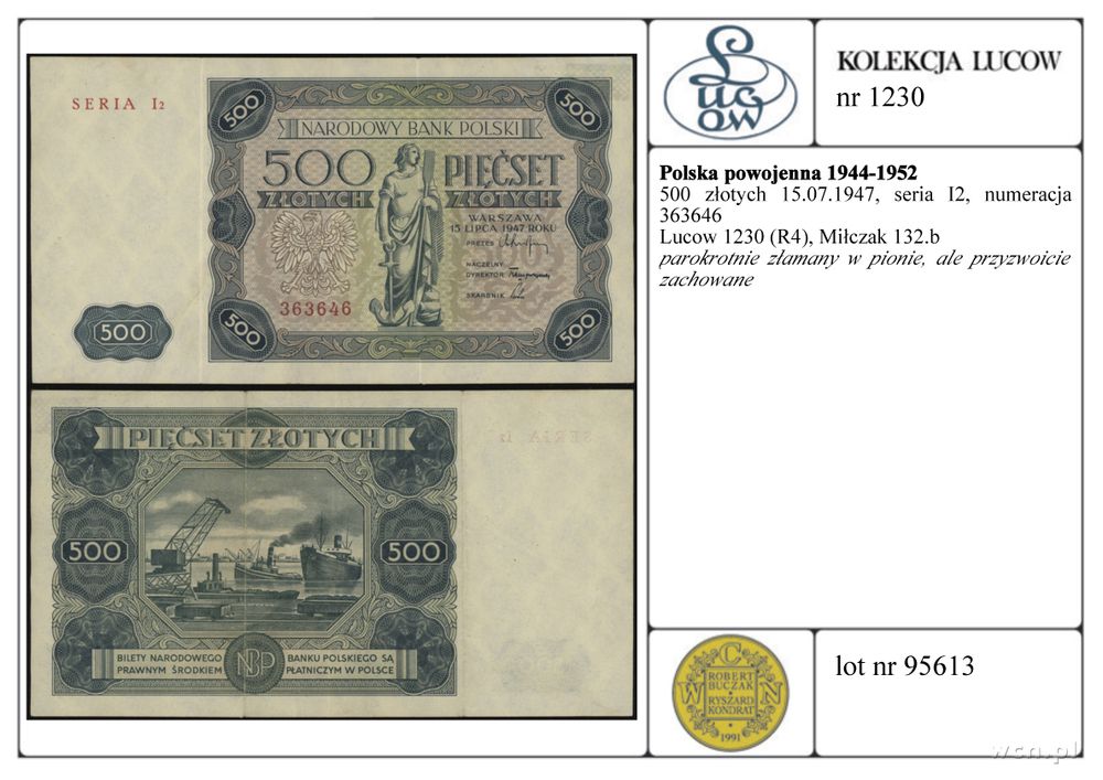 | Opis: | Polska - Polska powojenna 1944-1952, 500 złotych, 15.07.1947, seria I2, numeracja 363646 |