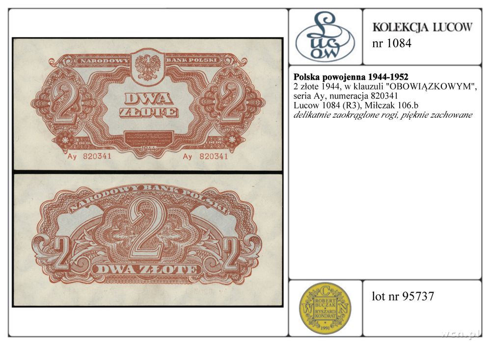 | Opis: | Polska - Polska powojenna 1944-1952, 2 złote, 1944, w klauzuli "OBOWIĄZKOWYM", seria Ay, numeracja 820341 |
