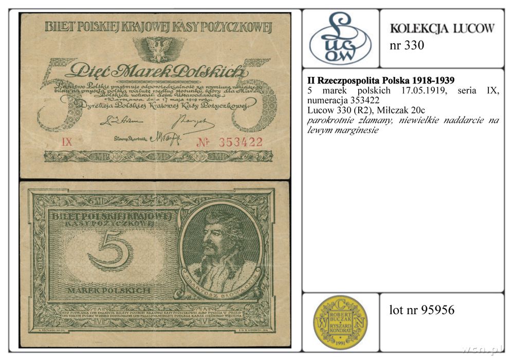 | Opis: | Polska - II Rzeczpospolita Polska 1918-1939, 5 marek polskich, 17.05.1919, seria IX, numeracja 353422 |