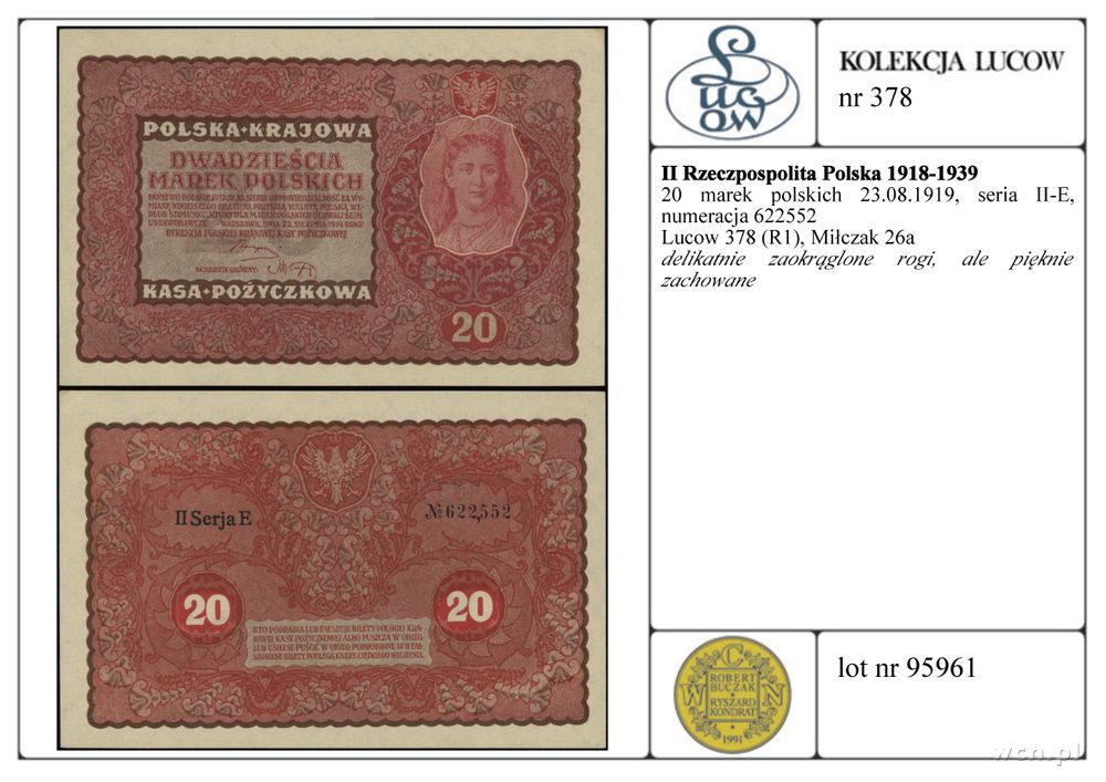 | Opis: | Polska - II Rzeczpospolita Polska 1918-1939, 20 marek polskich, 23.08.1919, seria II-E, numeracja 622552 |