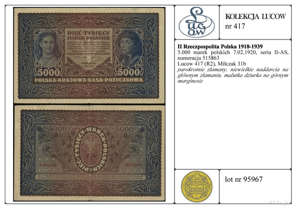| Opis: | Polska - II Rzeczpospolita Polska 1918-1939, 5.000 marek polskich, 7.02.1920, seria II-AS, numeracja 515863 |