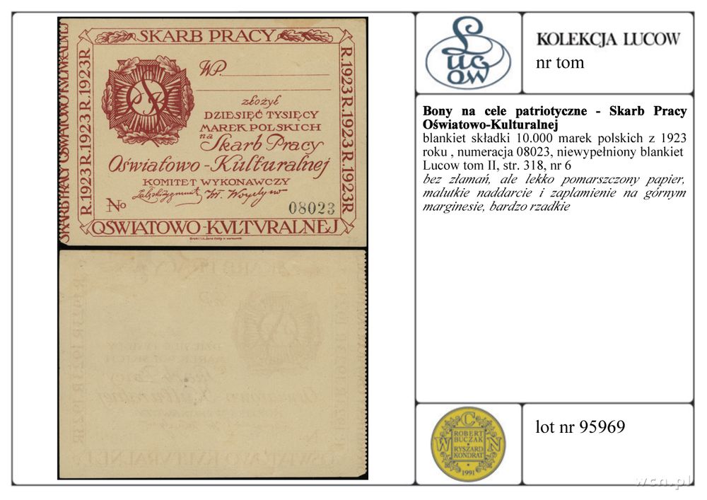 | Opis: | Polska - Bony na cele patriotyczne - Skarb Pracy Oświatowo-Kulturalnej, blankiet składki 10.000 marek polskich z 1923 roku, numeracja 08023, niewypełniony blankiet |