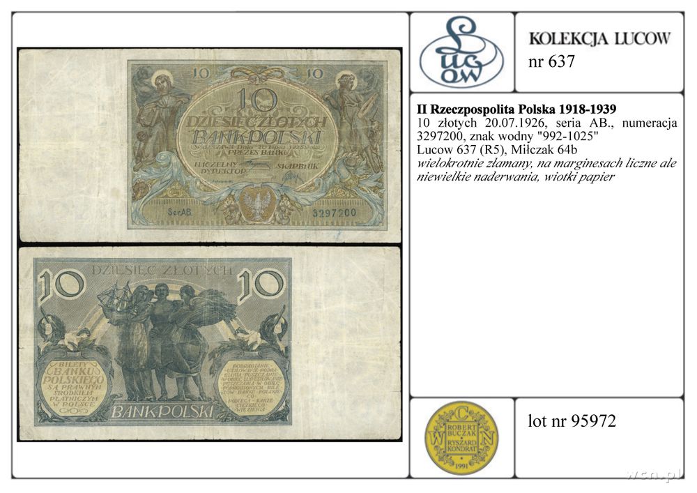 | Opis: | Polska - II Rzeczpospolita Polska 1918-1939, 10 złotych, 20.07.1926, seria AB., numeracja 3297200, znak wodny "992-1025" |