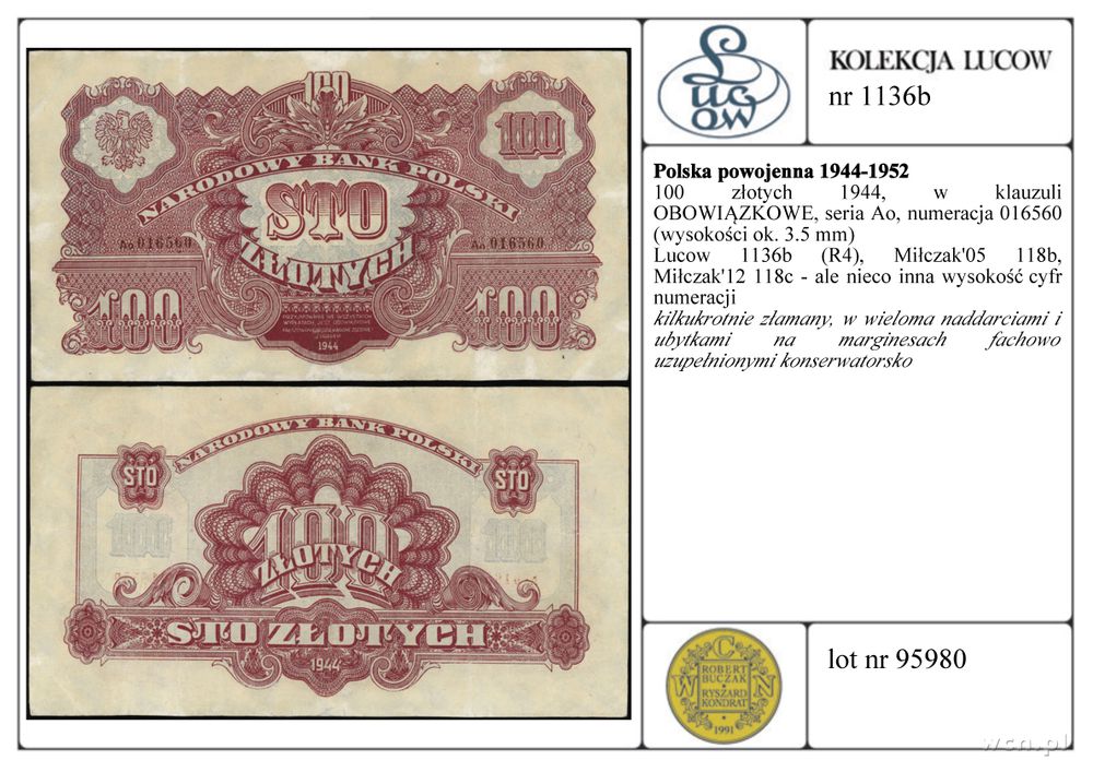 | Opis: | Polska - Polska powojenna 1944-1952, 100 złotych, 1944, w klauzuli OBOWIĄZKOWE, seria Ao, numeracja 016560 (wysokości ok. 3.5 mm) |