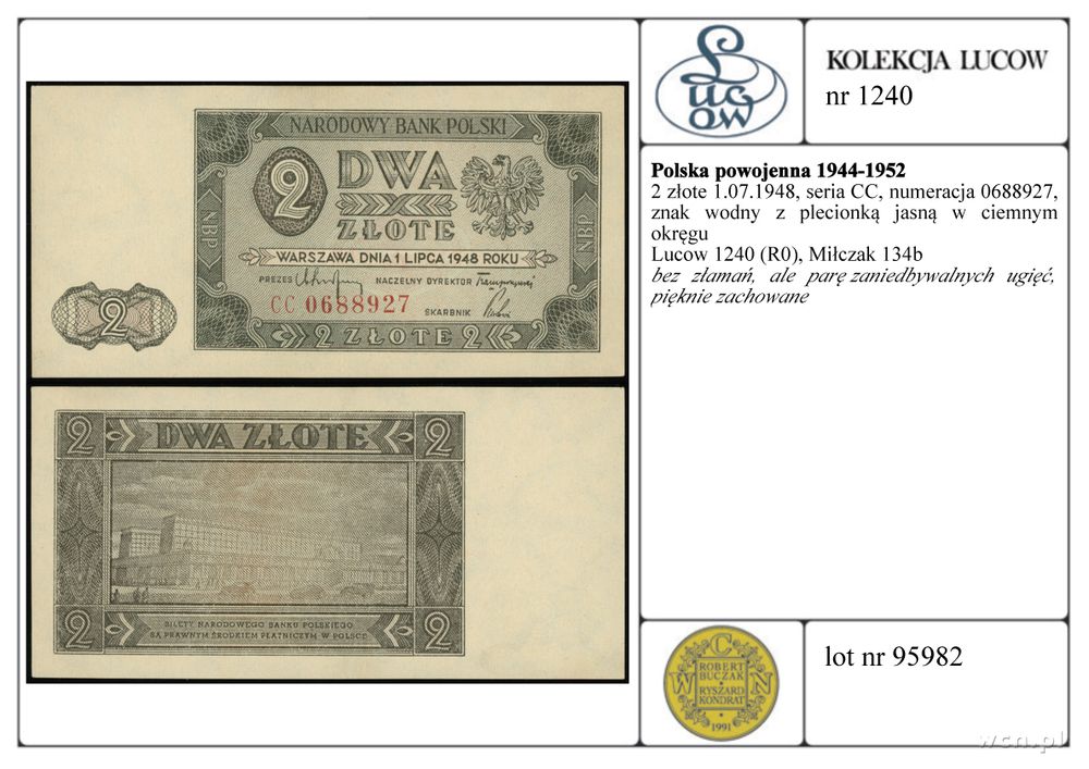 | Opis: | Polska - Polska powojenna 1944-1952, 2 złote, 1.07.1948, seria CC, numeracja 0688927, znak wodny z plecionką jasną w ciemnym okręgu |