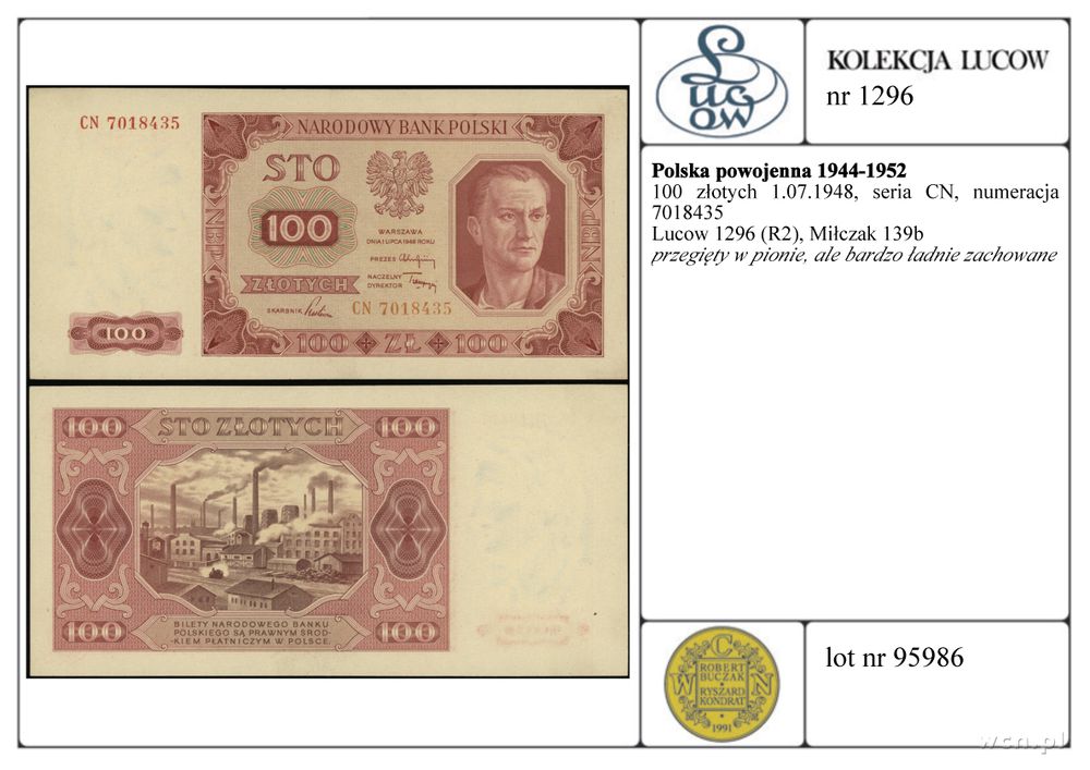| Opis: | Polska - Polska powojenna 1944-1952, 100 złotych, 1.07.1948, seria CN, numeracja 7018435 |