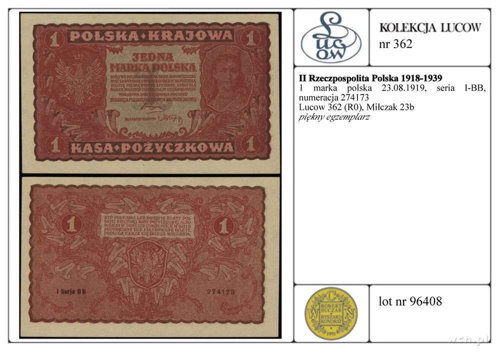 Polska - II Rzeczpospolita Polska 1918-1939, 1 marka polska, 23.08.1919, seria I-BB, numeracja 274173 |