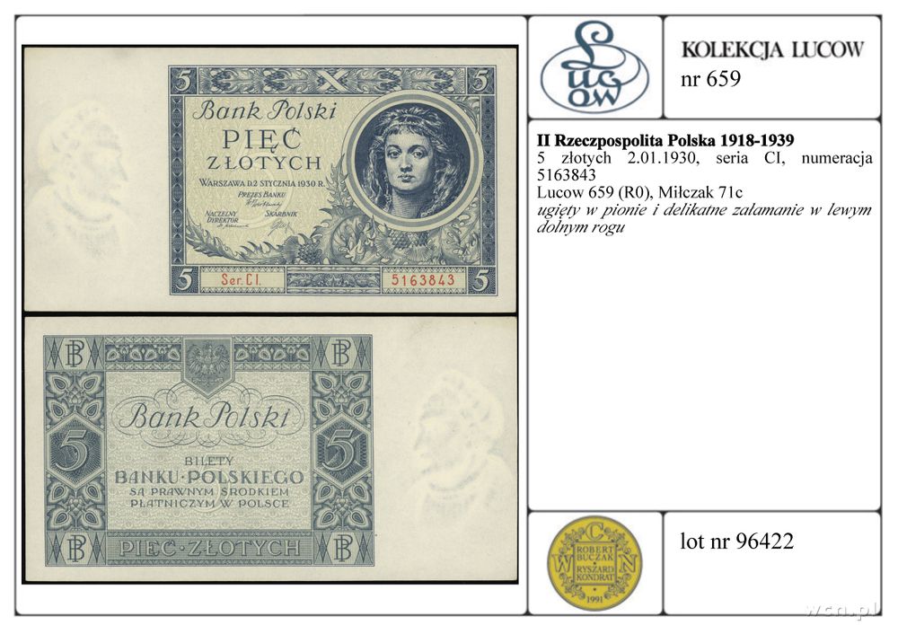 | Opis: | Polska - II Rzeczpospolita Polska 1918-1939, 5 złotych, 2.01.1930, seria CI, numeracja 5163843 |