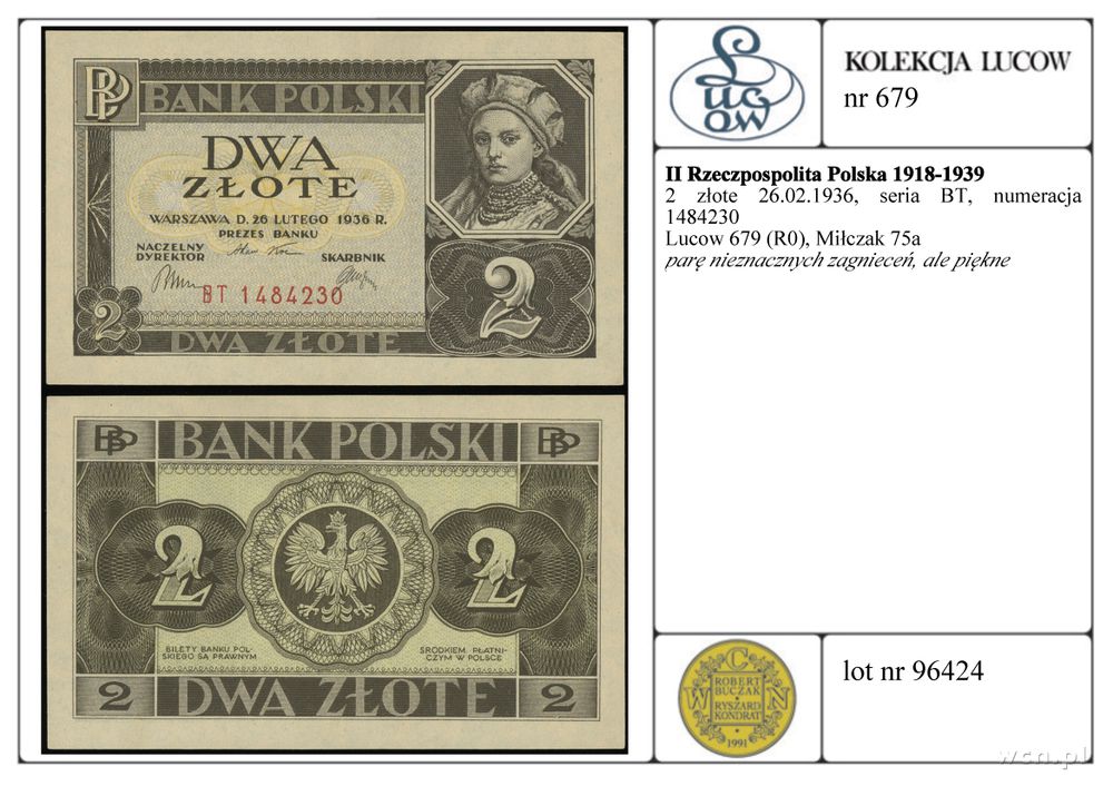 | Opis: | Polska - II Rzeczpospolita Polska 1918-1939, 2 złote, 26.02.1936, seria BT, numeracja 1484230 |