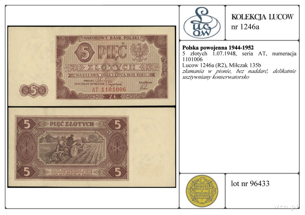 Polska - Polska powojenna 1944-1952, 5 złotych, 1.07.1948, seria AT, numeracja 1101006 |