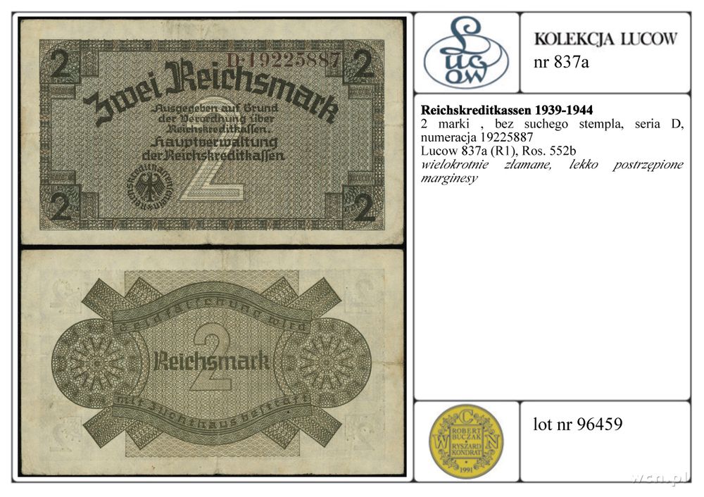 | Opis: | Niemcy - Reichskreditkassen 1939-1944, 2 marki, bez suchego stempla, seria D, numeracja 19225887 |