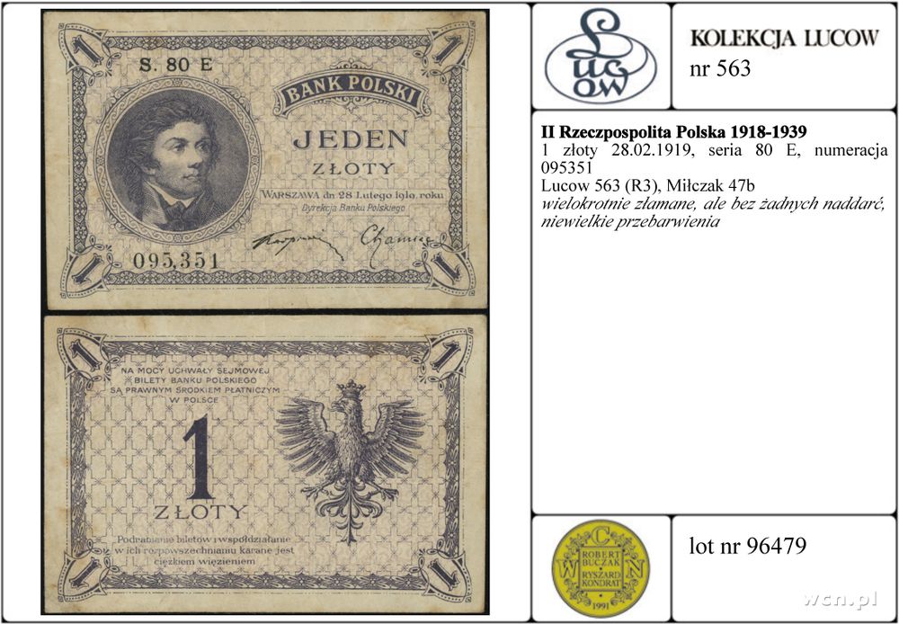 Polska - II Rzeczpospolita Polska 1918-1939, 1 złoty, 28.02.1919, seria 80 E, numeracja 095351 |