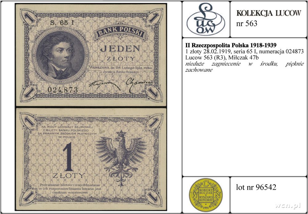 | Opis: | Polska - II Rzeczpospolita Polska 1918-1939, 1 złoty, 28.02.1919, seria 65 I, numeracja 024873 |