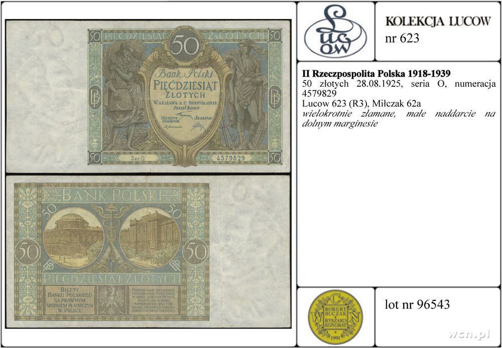 | Opis: | Polska - II Rzeczpospolita Polska 1918-1939, 50 złotych, 28.08.1925, seria O, numeracja 4579829 |