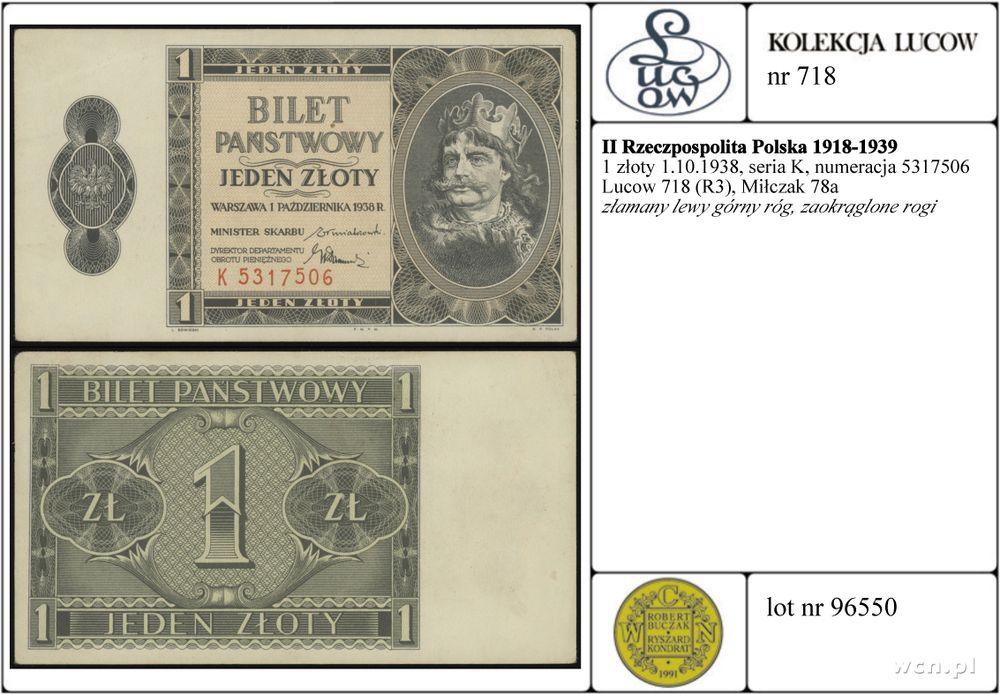 Polska - II Rzeczpospolita Polska 1918-1939, 1 złoty, 1.10.1938, seria K, numeracja 5317506 |