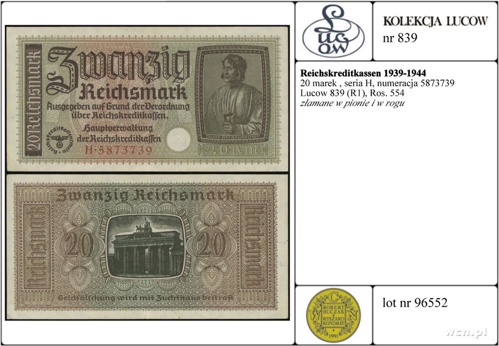Niemcy - Reichskreditkassen 1939-1944, 20 marek, seria H, numeracja 5873739 |