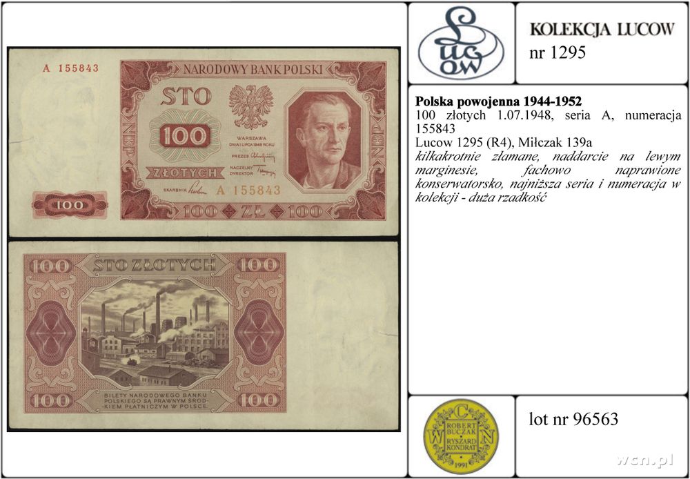 | Opis: | Polska - Polska powojenna 1944-1952, 100 złotych, 1.07.1948, seria A, numeracja 155843 |