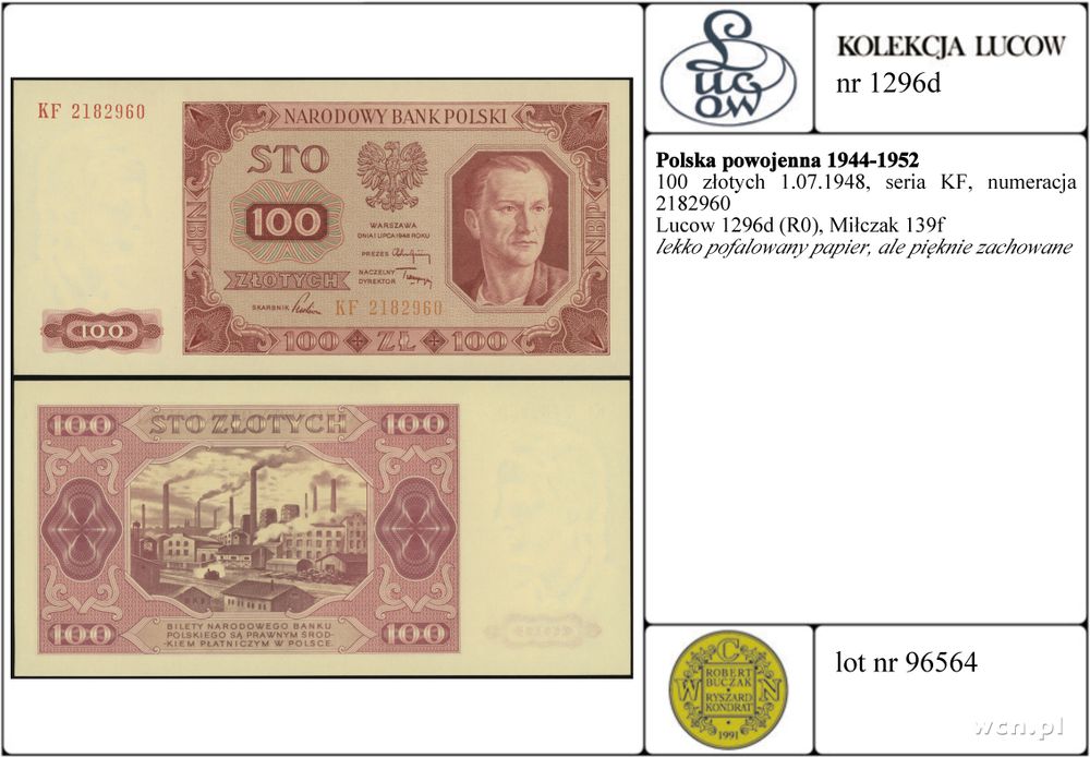 | Opis: | Polska - Polska powojenna 1944-1952, 100 złotych, 1.07.1948, seria KF, numeracja 2182960 |