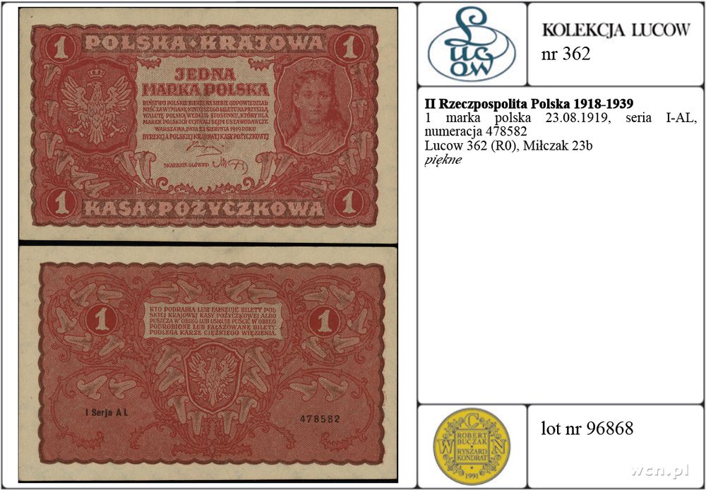 Polska - II Rzeczpospolita Polska 1918-1939, 1 marka polska, 23.08.1919, seria I-AL, numeracja 478582 |