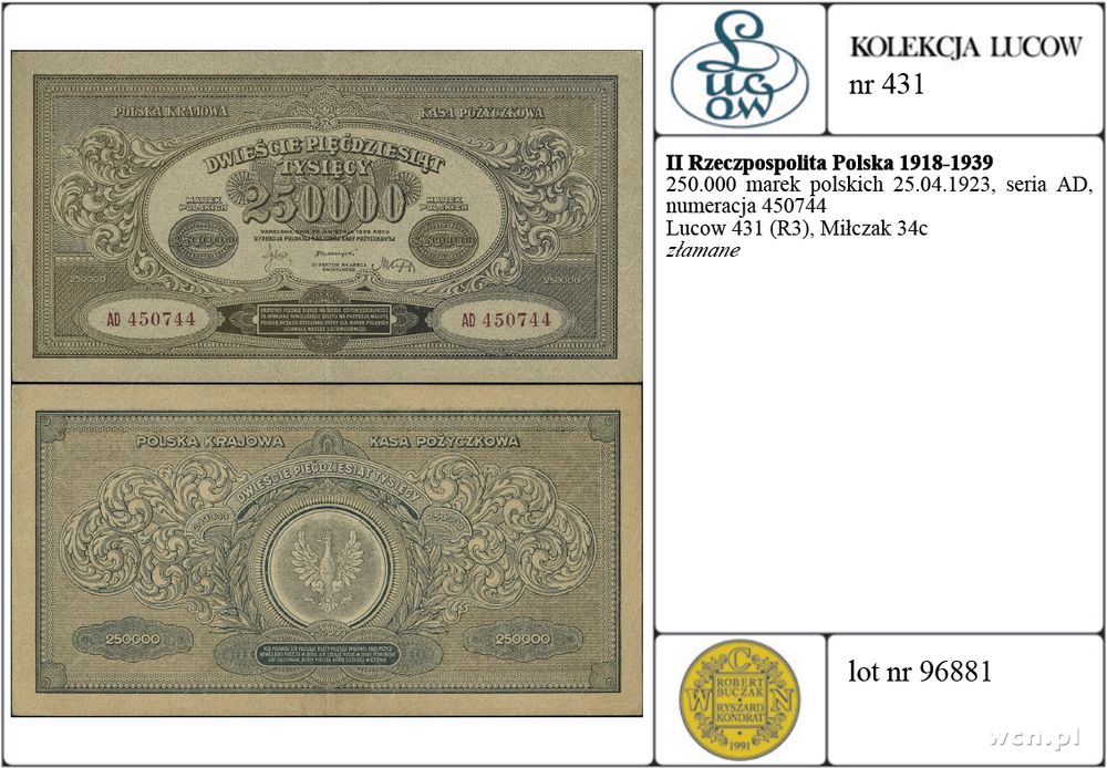 | Opis: | Polska - II Rzeczpospolita Polska 1918-1939, 250.000 marek polskich, 25.04.1923, seria AD, numeracja 450744 |