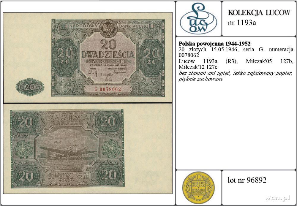 Polska - Polska powojenna 1944-1952, 20 złotych, 15.05.1946, seria G, numeracja 0078062 |