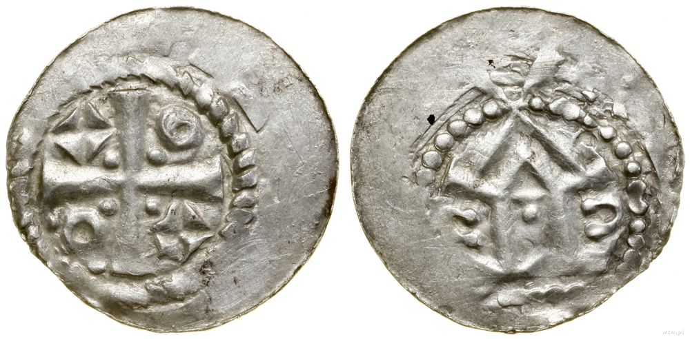 | Opis: | Niemcy - Saksonia - Otto III (983–1002), naśladownictwo denara typu OAP, Aw: Krzyż, w kątach naprzemiennie krzyż i pierścień, legenda, Rw: Kapliczka, wewnątrz kulka, po bokach dwa łuki zakończone kulkami, legenda |