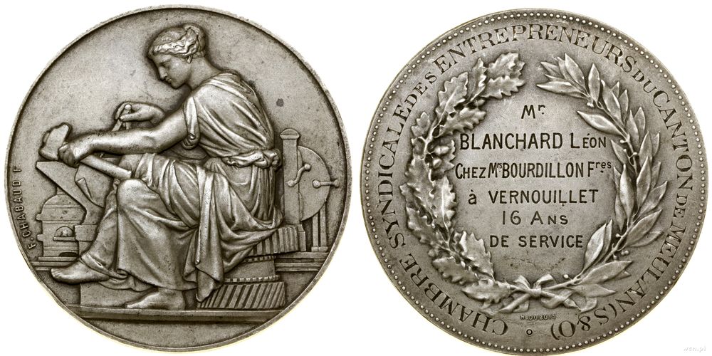 | Opis: | Francja - III Republika (1871–1940), medal nagrodowy, Aw: Kobieta siedżaca w lewo przy kowadle, po lewej sygnatura F. CHABAUD F, Rw: Wieniec, w którym Mr. / BLANCHARD LEON / CHEZ MRS BOURDILLON Fres. / s VERNOUILLET / 16 ANS / DE SERVICE, CHAMBRE SYNDICALE DES ENTREPRENEURS DU CANTON DE MEULAN (S&O), Obrzeże: Punca ARGENT |