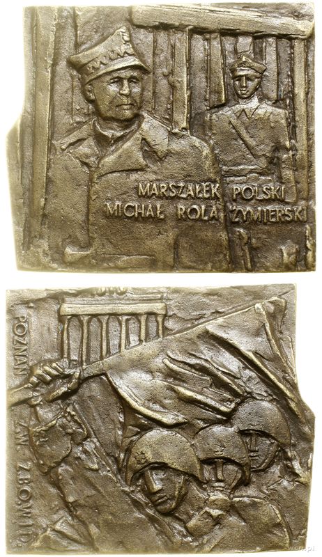 | Opis: | Polska - Polska Rzeczpospolita Ludowa (1952–1989), Marszałek Polski Michał Rola-Żymierski, Aw: Dwóch żołnierzy na tle Bramy Brandenburskiej, na dole MARSZAŁEK POLSKI / MICHAŁ ROLA ŻYMIERSKI, Rw: Trzech żołnierzy z flagą w lewo, w tle Brama Brandenburska, po lewej POZNAŃ - Z.W. Z.B.O.WID. |
