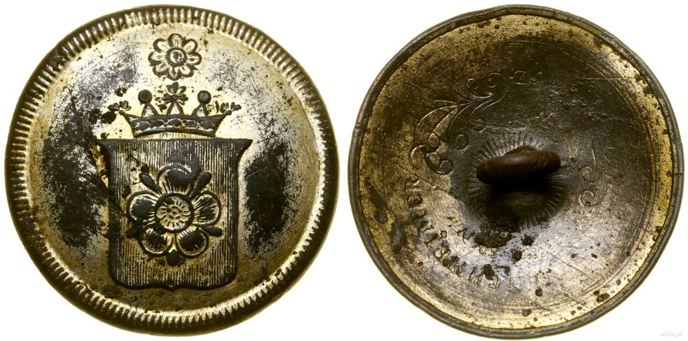 | Opis: | pozostałe - guziki, guzik herbowy, XIX wiek, Herb Poraj, na stronie odwrotnej sygnatura MUNCHHEIMER I SYN W WARSZ |
