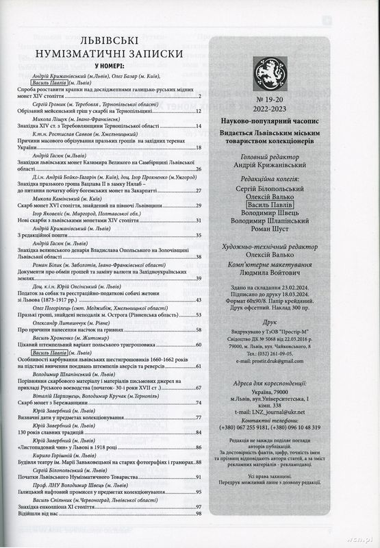 czasopisma, Львiвськi нумiзматичнi записки (Lwowskie Zapiski Numizmatyczne), nr 19–20/..