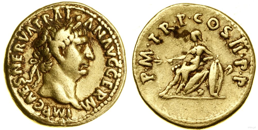 Opis: | Cesarstwo Rzymskie - Trajan (98–117), aureus, (98), Rzym, Aw: Głowa cesarza w wieńcu laurowym w prawo, IMP CAES NERVA TRAIAN AVG GERM, Rw: Germania siedząca na tarczach w lewo, trzyma gałązkę oliwną, P M TR P COS II P P |