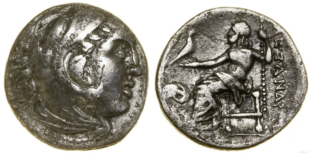 Opis: | Grecja i posthellenistyczne - Macedonia - Aleksander III Wielki (336–323 pne) i następcy, drachma, (ok. 310–301 pne), "Teos", Aw: Głowa Heraklesa w prawo, nakryta lwią skórą; Rw: Zeus siedzący na tronie w lewo, trzymający Orła i berło, z lewej głowa barana w lewo |