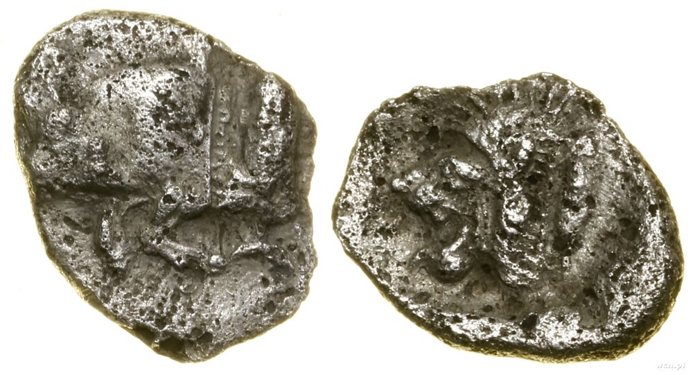 Opis: | Grecja i posthellenistyczne - Myzja - Kyzikos, hemiobol, (ok. V w. pne), Aw: Protom dzika w lewo, Rw: W kwadracie incusum głowa lwa w lewo |