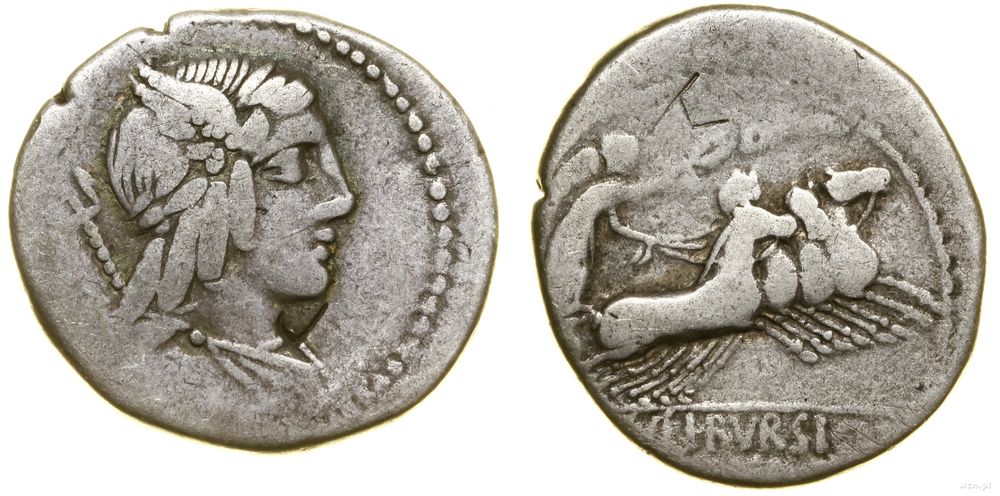 Opis: | Republika Rzymska - L. Julius Bursio (85 pne), denar, 85 pne, Rzym, Aw: Głowa mężczyzny w prawo, w wieńcu ze skrzydłami hermesa, z lewej znak kontrolny i trójząb; Rw: Wiktoria w kwadrydze w prawo, w odcinku [L IVLI] BVRSIO |